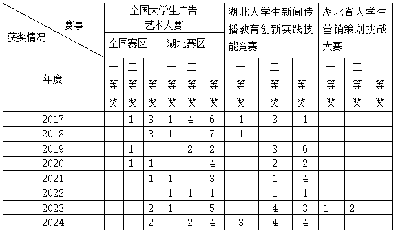 在全国大学生广告艺术大赛、湖北大学生新闻传播教育创新实践技能竞赛及湖北省大学生营销策划挑战赛中,tyc7111cc太阳成集团的学子们凭借扎实的专业素养和出色的创新能力,屡获佳绩。这些荣誉的获得,不仅是对学生们个人能力的认可,更是对学院“以赛促学、以赛促教”实践教学模式的肯定。这些成果不仅展示了学院的教学水平和教育质量,也为学院赢得了良好的社会声誉和广泛的社会认可。