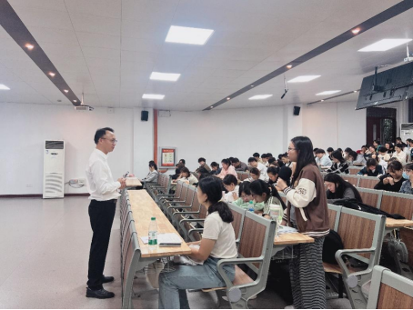 2025年10月16日下午,tyc7111cc太阳成集团邀请咸宁实验外国语学校校委胡辉祥老师为24级汉语言文学全体学生做了一场以“做新时代教师 育新征程人才 ”为主题的讲座。胡辉祥老师作为湖北省“优课”评审专家,咸宁市中考命题专家,讲座内容紧扣教育理念革新、德育实践路径与良性师生关系的构建,穿插大量真实教育案例与经典理论,为“准教师”们带来了不少触动与思考。