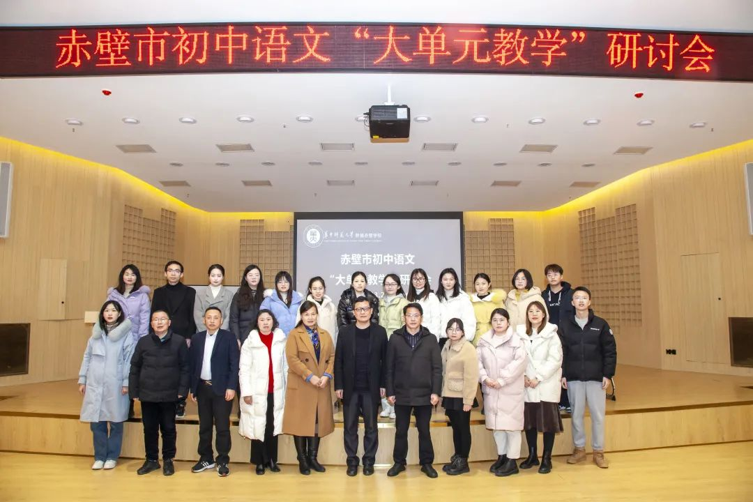 为及时了解基础教育改革的前沿动态,提高我院师范生培养质量,2023年2月23日上午,我院教师夏红星应邀参加了由华中师范大学附属赤壁学校和咸宁市任丹初中语文工作室联合组织的“初中语文大单元探索与实践”活动。本次活动在赤壁市华中师范大学附属赤壁学校展开,活动邀请了华师赤壁学校党委副书记余先德、华师赤壁学校初中部校长王少波、特级教师黄新阶、赤壁市教研员陈志军、咸宁市名师工作室主持人任丹等领导专家,以及咸宁市任丹初中语文工作室骨干成员和华师赤壁学校初中部语文教师。