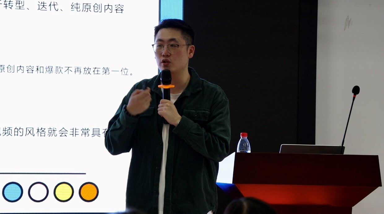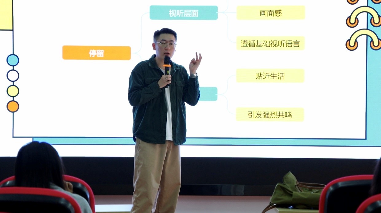 活动在实训大楼1505教室进行,戴弋超导演以“换个思路,好片子一定都藏在镜头里吗”为题,以"视频是现在的主流”为切入点,围绕短视频思维逻辑转变、商业角度重新认识平台等多个方面,讲解什么是短视频、如何做出好作品和各个短视频平台的特点。他引用网络热门视频,分析视频的内容和风格,让同学们更加直观的了解短视频热门的原因。