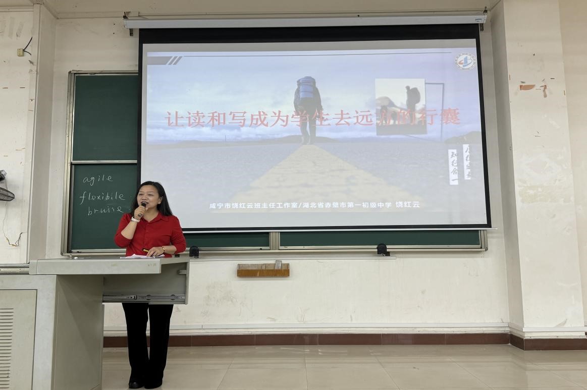 2024年4月11日下午,太阳成集团tyc7111教三501教室内座无虚席,一场主题为《让读和写成为去远方的行囊》的讲座在此隆重举行。本次讲座特邀全国优秀教师、全国优秀班主任、赤壁市第一初中饶红云老师主讲。她以丰富的教育经验和深厚的学术造诣,为师生们带来了一场关于阅读和写作的精神盛宴。本次讲座由写作-中教法教研室主任黎琪珍主持,学院副院长谭辉煌、专业教师夏红星出席了活动。