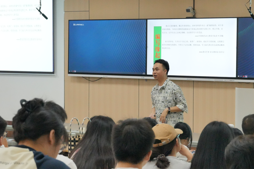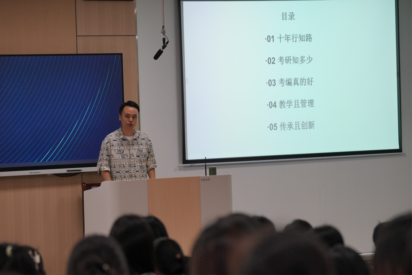 紧接着,张老师从考研、考编、教学管理等方面分享了他的个人经验和感悟认识。他以自己的经历为托举,讲述了自上而下做好职业生涯规划对生活和工作的影响,接着用图表的方式列举了深圳市福海中学语文组成员学历,摆出深圳市宝安区中小学2024年下半年的教师招聘公告,用科学严谨的方式说明了高学历的重要性,直观地展示了就业形势的严峻性。张老师从自身教研的反复探索中告诫同学们作为未来的语文教师,一定要坚持教研结合,定期阅读权威的语文期刊,注重实践,提高个人的语文核心素养,增强个人专业能力。