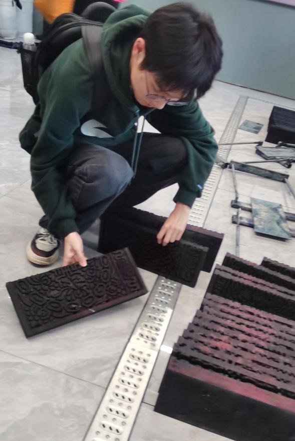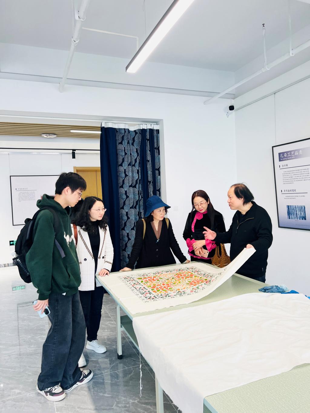 蓝印花布博物馆,作为国内首家集收藏、展示、研究、生产、经营于一体的专题博物馆,为考察团队提供了丰富的学习资源。博物馆内设有多个展区,分别展示了蓝印花布的制作工艺、历史渊源、文化内涵以及在现代社会的应用。历史渊源展区通过文字、图片和实物等多种形式展现了蓝印花布的历史变迁过程。在制作工艺展区,团队成员在博物馆工作人员的引领下,不仅观赏了一幅幅精美的蓝印花布展品,还参与体验了蓝印花布的制作过程,从原料的选取、刻板样式的设计,到染色、印花、固色等各个环节,亲眼目睹蓝印花布从原料选取到成品出炉的全过程,团队成员通过亲身体验后收获颇多,对蓝印花布也有了更加全面深入地了解和认识,对匠人们的精湛技艺赞叹不已。