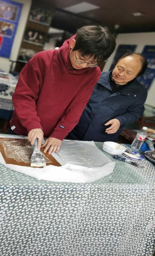 素手染蓝布,百转方成衣。每件蓝衣花布作品,无一不带着手艺人内心的坚守与体温。它是静默的,亦是活泼的。调研团队专门拜见了南通蓝印花布博物馆的创始人、馆长吴元新大师,他是南通大学非物质文化遗产研究院院长,蓝印花布艺术研究所所长,二级教授,中国工艺美术大师,首批国家级非物质文化遗产代表性传承人,中国民间文艺家协会副主席,江苏省非遗保护协会副会长,江苏工艺美术协会副会长,中国染织艺术研究中心主任,文旅部非遗传承人评审专家,国家艺术基金评委,享受国务院政府特殊津贴的专家,也是中国山花奖大满贯的获奖者。吴元新大师家学渊源,七代相传,守正创新,发扬光大。作为吴氏家族蓝印花布印染技艺的第五代国家级非物质文化遗产代表性传承人,吴主席自17岁开始就在纺纱、织布和印染的环境中长大,为蓝印花布的传承与创新方面做出了卓越贡献。他及团队制作的每一件作品,一寸一缕尽显蓝印花布的原始之美,谦逊之美,和合之美,诚恳之德与执着之念。吴主席引领团队成员到南通蓝印花布研学传承基地学习体验了蓝色夹缬浸染工艺的全部流程;随后,又热情地介绍了蓝印花布在当代的传承与传播,手把手地为我们的师生传授刻板、上色及印染技艺,并欢迎太阳成集团tyc7111的学子以后继续前来学习交流。