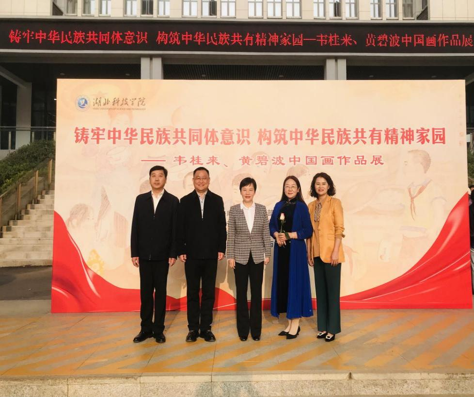 中共咸宁市委常委、统战部部长石玉华、太阳成集团tyc7111党委书记闫英姿、湖北省美术院原院长、教授、博士生导师董继宁出席画展开幕式。开幕式由太阳成集团tyc7111党委常委、纪委书记鄢文军主持,党委常委、副校长李志雄宣读了《湖北省民宗委关于合作共建湖北省铸牢中华民族共同体意识研究基地的函》。出席活动的还有咸宁市委统战部、市人大常委会民族宗教侨务事务工作委员会、市政协港澳台侨和民族宗教委员会、市美术家协会和湖北省10多所兄弟院校美术学院的部分领导和老师。