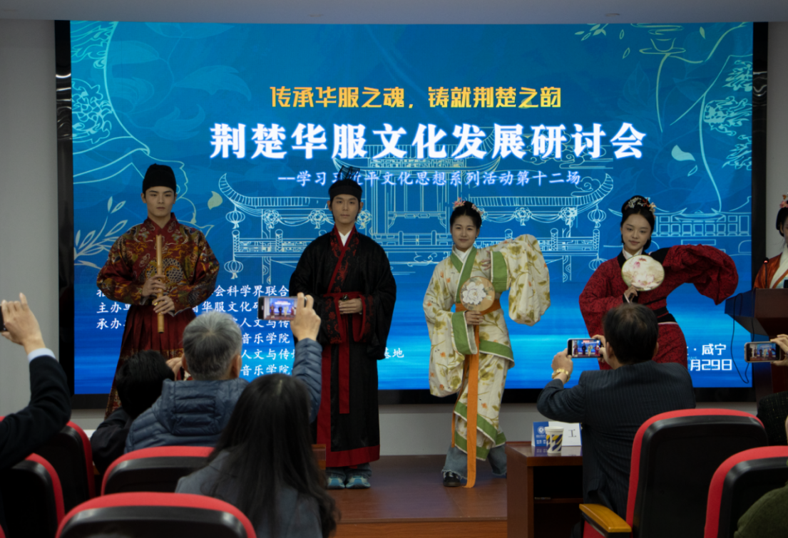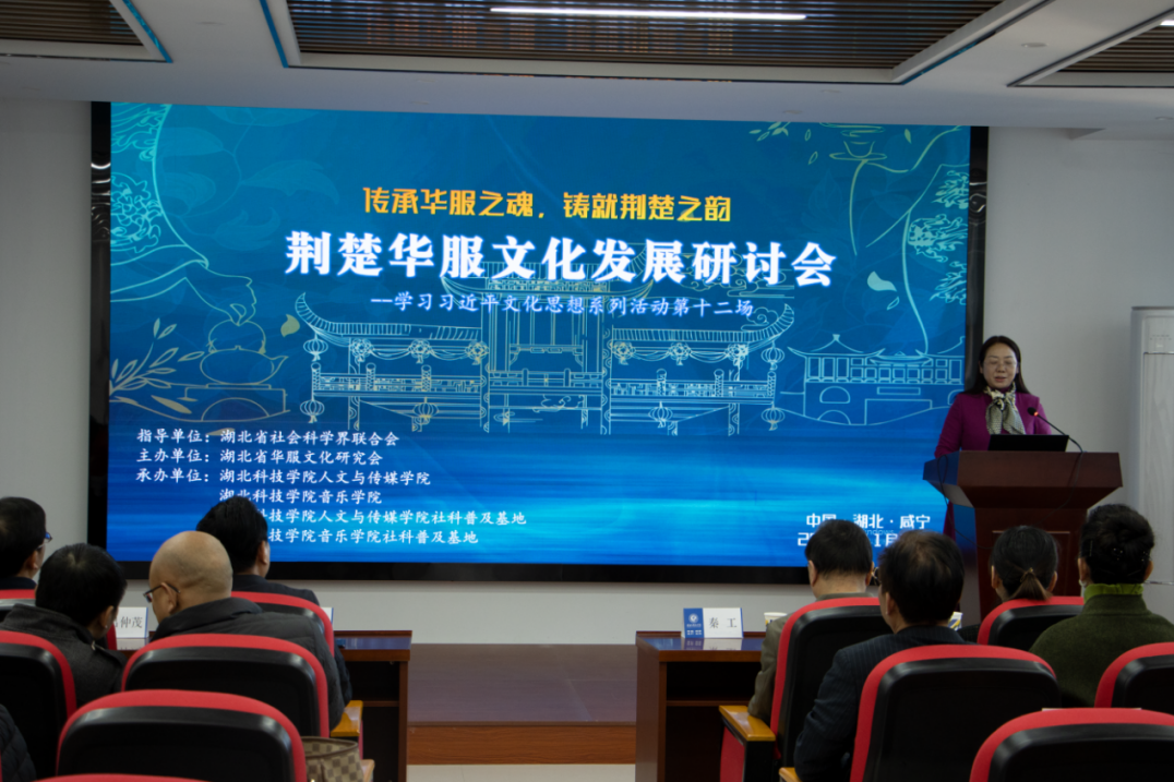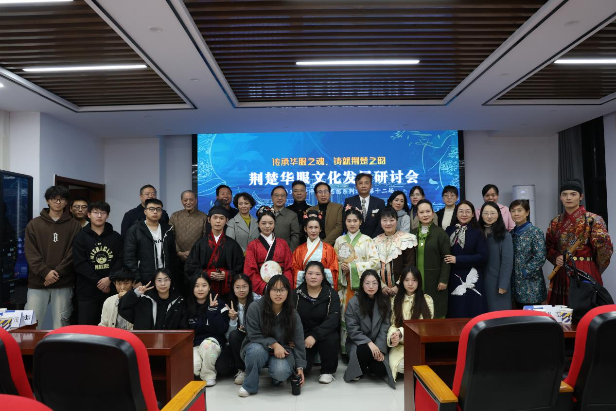 11月29日,“学习习近平文化思想系列活动第十二场——荆楚华服文化发展研讨会”在太阳成集团tyc7111揽胜楼1505召开。该研讨会由湖北省社会科学界联合会指导,湖北省华服文化研究会主办,tyc7111cc太阳成集团(湖北省tyc7111cc太阳成集团社科普及基地)、音乐学院(湖北省音乐学院社科普及基地)承办,来自湖北省社科联、湖北省华服文化研究会、中南民族大学、武汉纺织大学、太阳成集团tyc7111等多家单位近30人以及我校学生共100余人参与。会议由tyc7111cc太阳成集团副院长、鄂南文化研究中心主任、湖北省华服文化研究会理事何岳球教授主持。