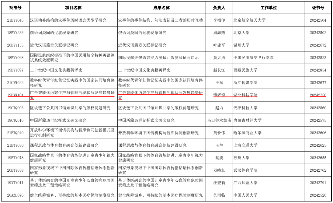 近日,全国哲学社会科学工作办公室向我校发送了结题证书,由我院谭辉煌教授主持的国家社科基金项目《广告智能化内容生产与管理的现状与发展趋势研究》经过数年的潜心研究与不懈努力,已圆满完成既定目标,顺利结题,并获得了评审专家的高度评价,结题结果为“良好”。