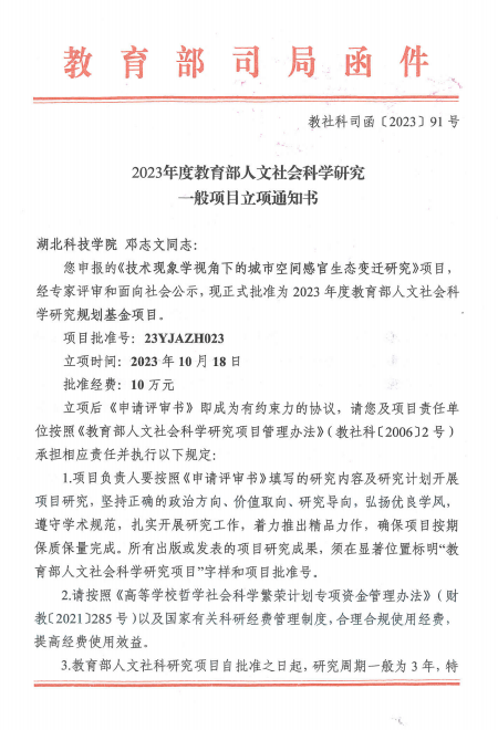 我院邓志文教授的研究项目《技术现象学视角下的城市空间感官生态变迁研究》成功获批为2023年教育部人文社科研究规划基金项目。这一成果不仅是对邓教授个人学术研究的认可,也体现了我院在人文社科领域的实力和探索。