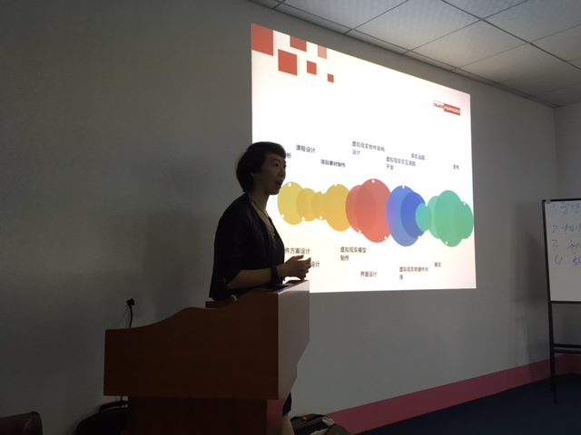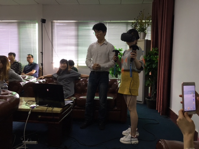 之后,遥知公司总经理王友姣女士进行了报告发言,她介绍了当前VR技术的飞速发展,指出虚拟现实是互联网行业的下一个风口,且技术已基本成熟,应用大量涌现。虚拟现实将颠覆游戏、医疗、建筑设计、动漫、艺术设计等几乎所有产业,应用到几乎所有学科。对于一些成本高昂或危险行业的教育与实训,VR教育将会提供最优化的解决方案。随后,遥知公司的两位工程师将带来的VR设备进行了安装,并结合该公司与武汉高校共同合作的教学项目成果,邀请在座的各位老师和同学进行亲身体验和直观感受。VR带来的沉浸感和互动性给大家带来强烈、逼真的感官冲击和身临其境的体验,令体验者惊喜连连。部分教师饶有兴致地对虚拟现实如何应用于自己从教的学科与遥知集团的工程师进行深入探讨与交流。