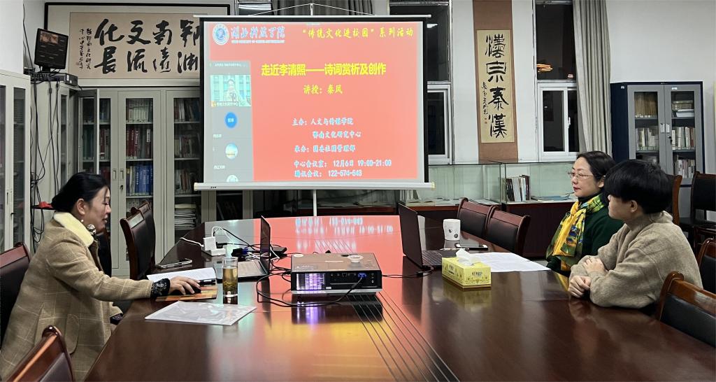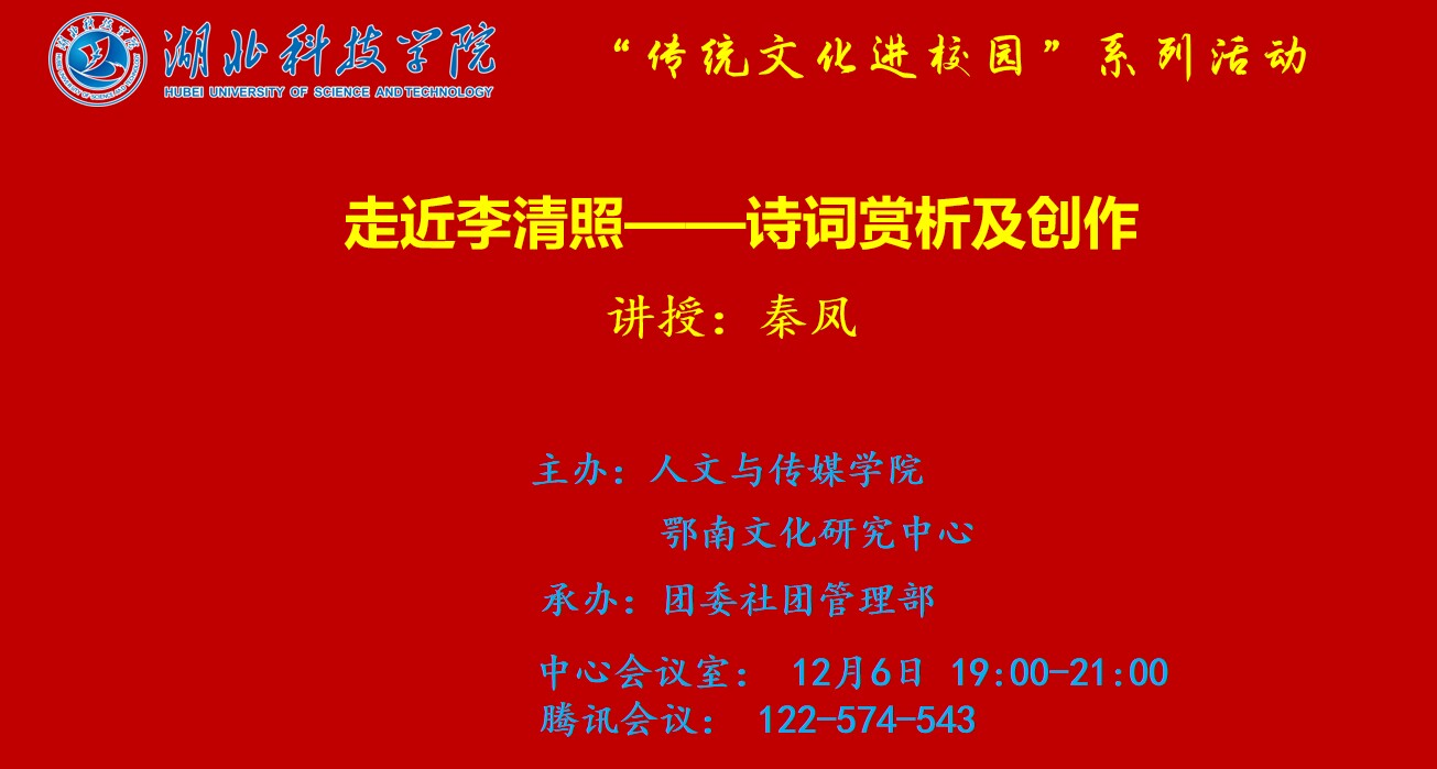 雅言传承文明,诗词浸润人心。中国有五千年文明,三千年诗韵,诗词是文化自信的凝结,诗词是传承古今的歌唱。为继承和弘扬中华经典文化,提高学生对诗词的写作能力和鉴赏能力,进一步加强校园文化建设,丰富学生人文素养,由我校tyc7111cc太阳成集团、鄂南文化研究中心主办,校团委社团管理部承办的“传统文化进校园”系列活动,特邀请太阳成集团tyc7111客座教授、湖北省中华诗词学会副秘书长兼女子诗词工作委员会副主任、咸宁市诗词楹联学会副会长、《九州诗词》副主编秦凤为我校“式微汉文化社”“雨月剧社”“诗词楹联协会”的社(会)员及对传统文化兴趣的师生做题为《走近李清照——诗词赏析及创作》的专题讲座。