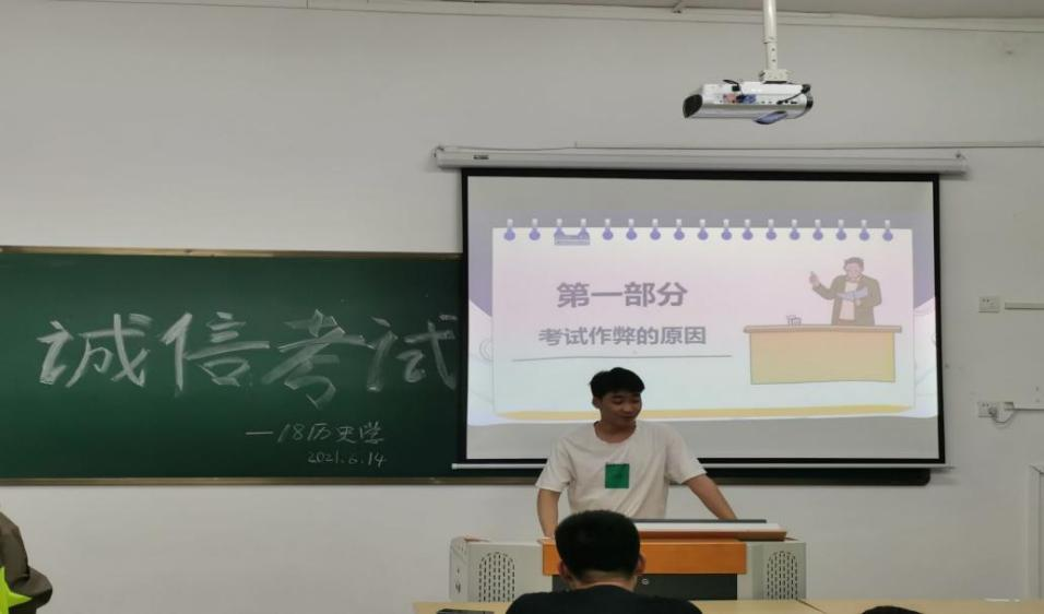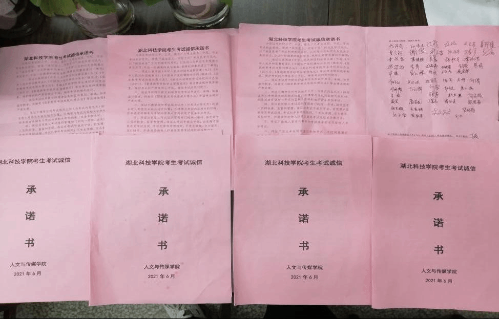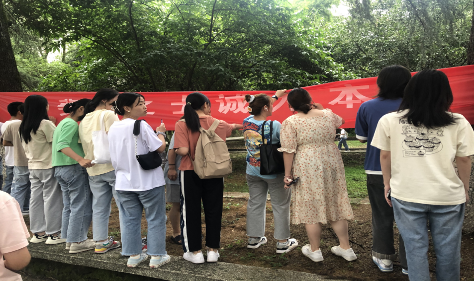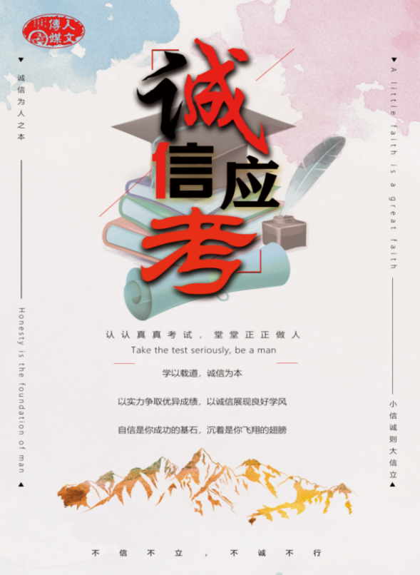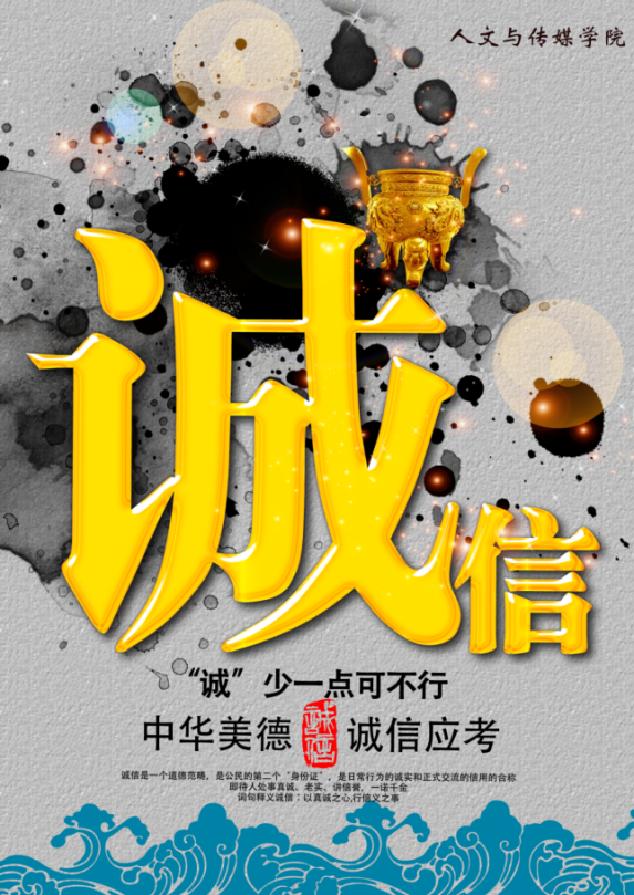 此次活动主要通过征集学生海报作品、主题班会和横幅签名等三种学生喜闻乐见的形式开展。为提高学生在此活动中的参与度,6月10日—6月20日期间,我院面向全院学生征集以“学以载道,诚信为本”为主题的海报设计作品,并于6月21日将部分优秀的海报设计作品进行展出。6月14日晚七点,我院利用周日集中考评时间组织各班召开主题班会。此次主题班会主要从案例分析、法条介绍等方面开展,让大家进一步了解国家对考试作弊的相关处理办法与规定,班会最后同学们还签署《太阳成集团tyc7111考生考试诚信承诺书》,以此规范自身行为。我院于6月18日召集各班学生在“斐然之士诚为本,凤鸣朝阳信为先”的横幅上签字承诺。