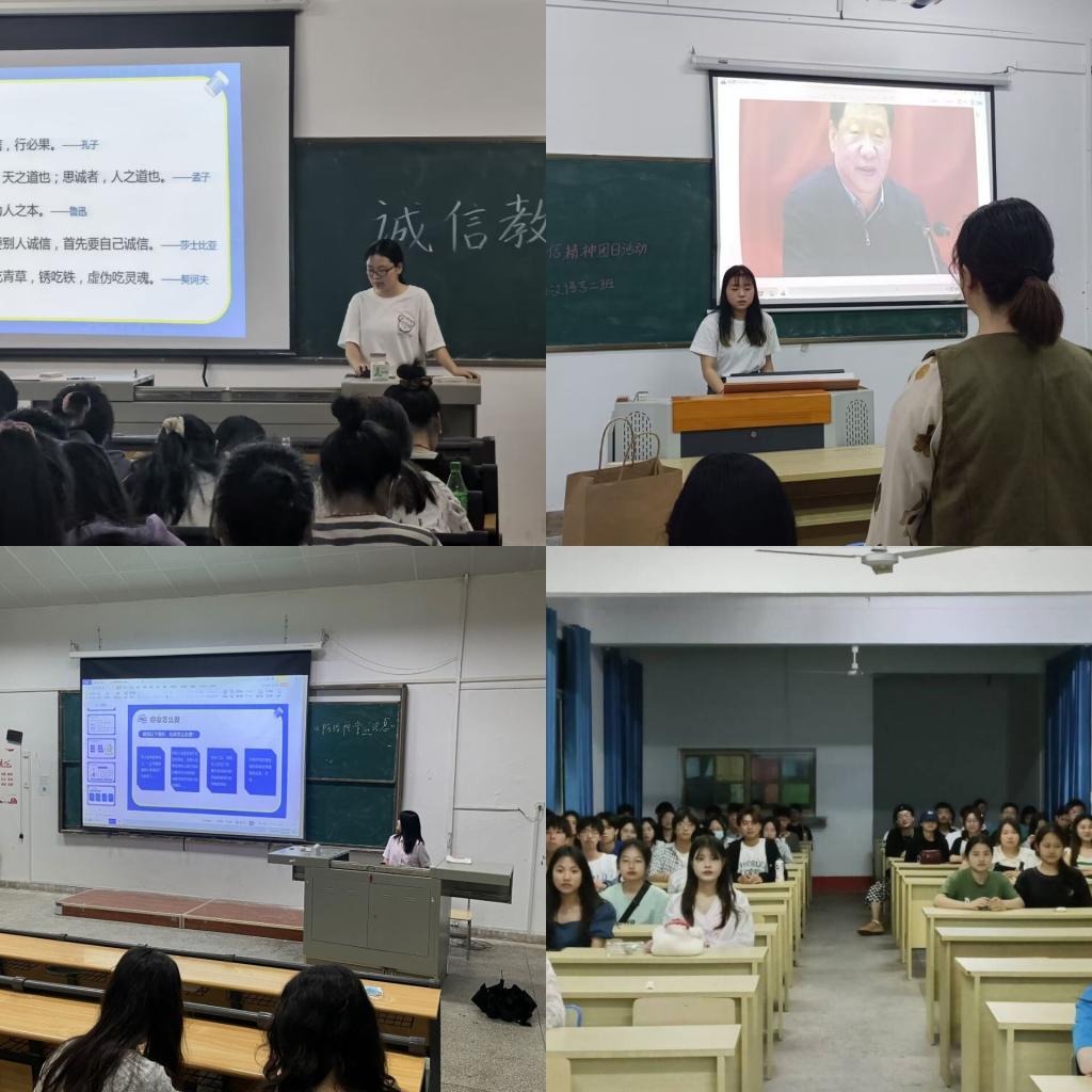 班长围绕诚信定义、诚信守则、诚信考试三个方面为同学们进行讲解,结合名人名言以及现实故事的案例,让同学们对诚信有了很深层次的了解,同时解释了学生作弊的心理并分享应对现实生活中的诚信问题的方法。此外,各班班长还为同学们播放了关于诚信的动画视频,通过两个作弊案例,让同学们意识到了诚信对当代大学生的重要性,要做到杜绝作弊、诚信应考。最后,班长详细介绍了诚信守则,再次提醒同学们做诚信事、当诚信人。21级汉语言文学二班汤晓晴同学表示:本次诚信主题教育班会让我认识到诚信的重要性,要将诚信融入日常生活中的每一件小事,真正做到诚实守信。同时也提高我们在即将来临的各种考试里独立思考及综合素质,加强了我们在学习生活中的诚信观念,使我们充分的认识到了诚信的重要性,形成有广度、有深度、有社会影响力的诚信精神。