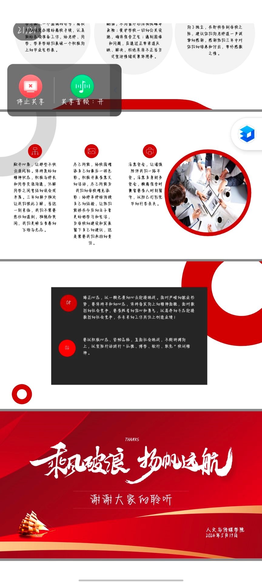 为加强我院毕业生的法治教育,提升他们的法律素养和自我保护能力,为他们即将踏入社会、迈向职场做好充分的准备。2024年5月19日晚,我院2020级各班通过线上与线下相结合的方式开展了“法治护航,阳光成长”法治教育主题班会,班会由各班班主任主持,全体毕业生参加。