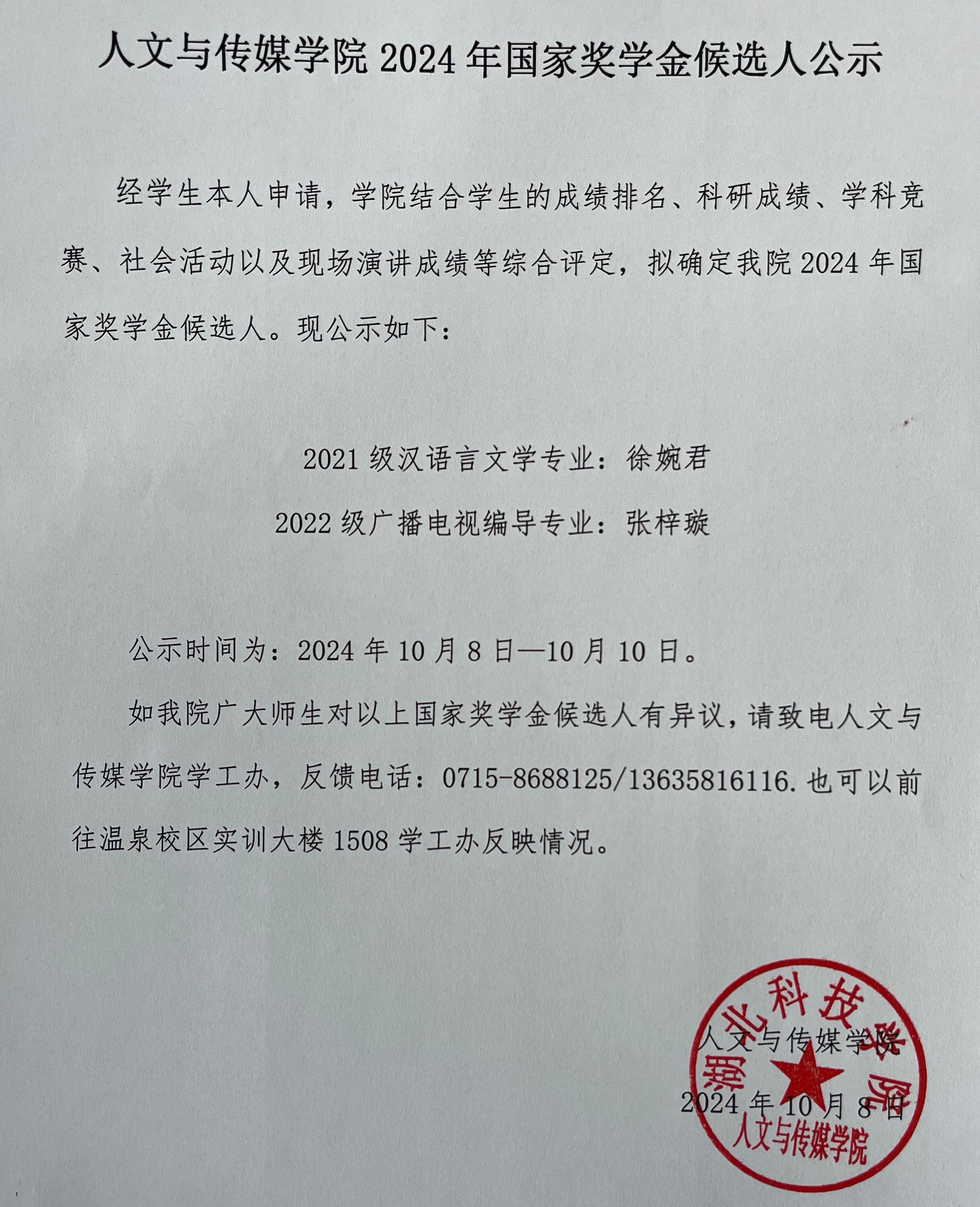 tyc7111cc太阳成集团2024年国家奖学金候选人公示