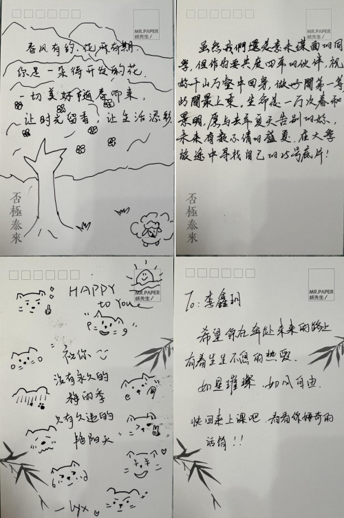 班委们将晚霞染成明信片背景,用镜头定格玉兰绽放的刹那,在泛着墨香的手作信笺上,一笺信纸载情长 。"鑫玥你看!教学楼前的桃树开花了,我们偷偷拍下了你错过的晚霞"。 班委们特别策划的"时空明信片"行动中,同学们亲手在背面写下温暖寄语。"期待早日相聚课堂"、"我们永远是你的课桌邻居"......当39份手写信札被麻绳串连成册,泛黄的纸页间流淌的不仅是墨迹,更是少年人特有的赤诚。