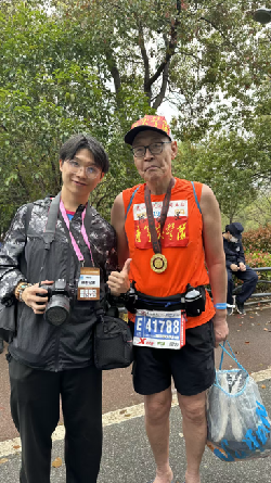 作为摄影记者,金玺龙同学全程记录了汉马的精彩瞬间。从起点到终点,他不仅拍摄了跑者的拼搏瞬间,还捕捉到了赛事中许多感人的故事。例如,他遇到了从加拿大远道而来的陈晓星爷爷,爷爷穿着兄弟的红色运动服,带着1975年的光谷马拉松参赛牌,完成了对已故兄弟的承诺。这些珍贵的画面不仅为赛事报道增添了人文色彩,也体现了金玺龙同学敏锐的新闻嗅觉和深厚的人文关怀。