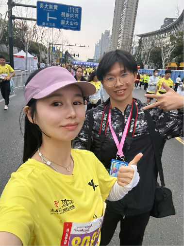 (刘月老师与学生金玺龙在武汉马拉松赛道起跑点)