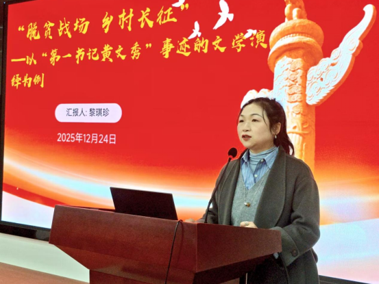 讲座伊始,黎琪珍老师以学生撰写“第一书记黄文秀”事迹的习作引入,深入讲述了黄文秀在脱贫攻坚一线用生命践行初心的感人故事。她指出,黄文秀的事迹之所以动人,不仅在于其奉献精神,更在于她将“小我”融入“大我”的人生抉择,而这正是文学作品“人民性”的鲜活体现。