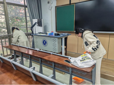 活动现场,志愿者们手持扫帚、抹布、垃圾夹、垃圾袋等清洁工具,依照提前规划的区域分工,有序前往教学楼、办公室等责任点位开展清洁工作。大家分工明确、协作配合,认真清扫地面垃圾、擦拭门窗桌椅、归置公共区域杂物,全力清除卫生死角。