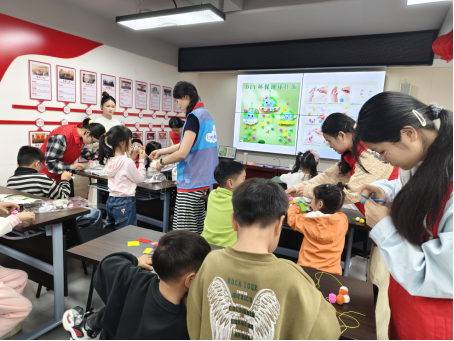 活动临近结束,志愿者带领孩子们制作卡通“世界地球日”挂件。在志愿者的耐心指导下,孩子们动手拼贴、连串,一步步将零散的材料变成了充满童趣的地球主题挂件。在锻炼孩子们动手能力的同时,也潜移默化地树立起尊重自然保护自然的生态文明理念。