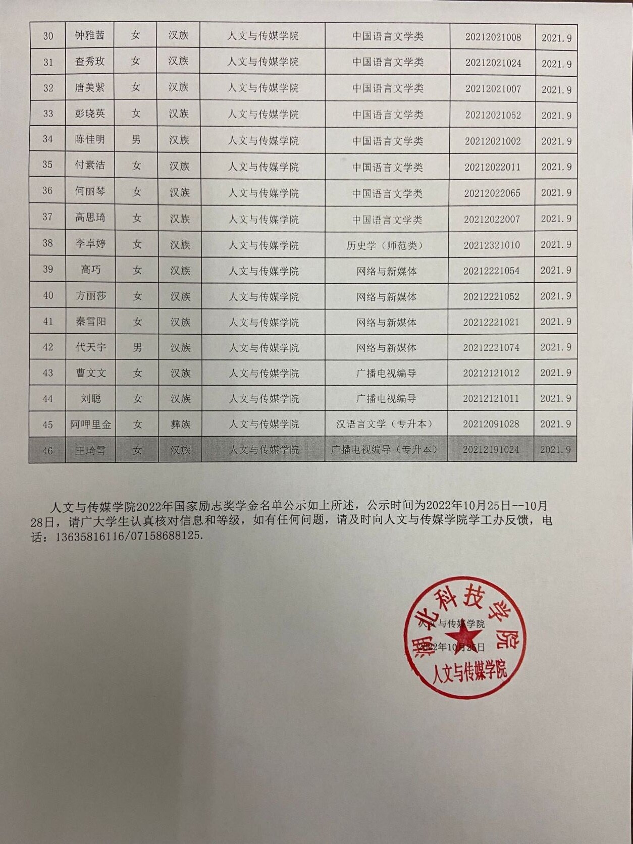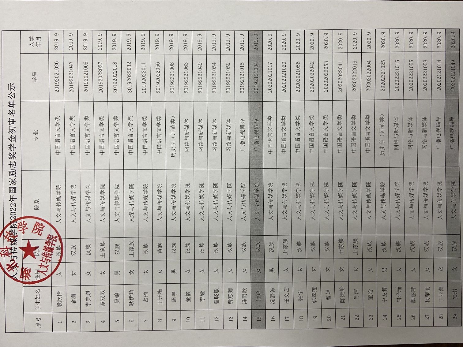 tyc7111cc太阳成集团2022年国家励志奖学金初审名单公示