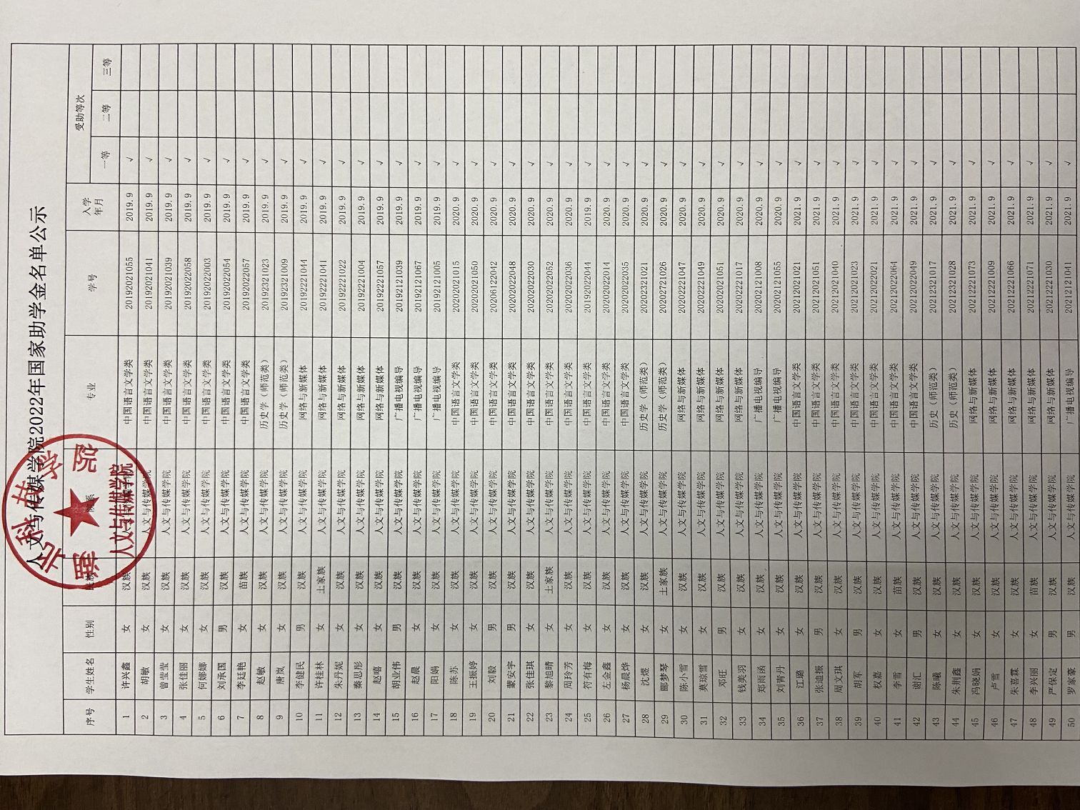 tyc7111cc太阳成集团2022年国家助学金名单公示