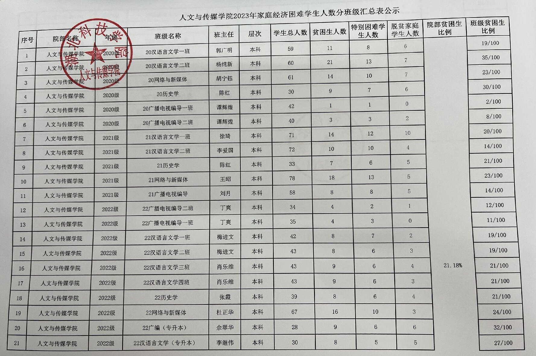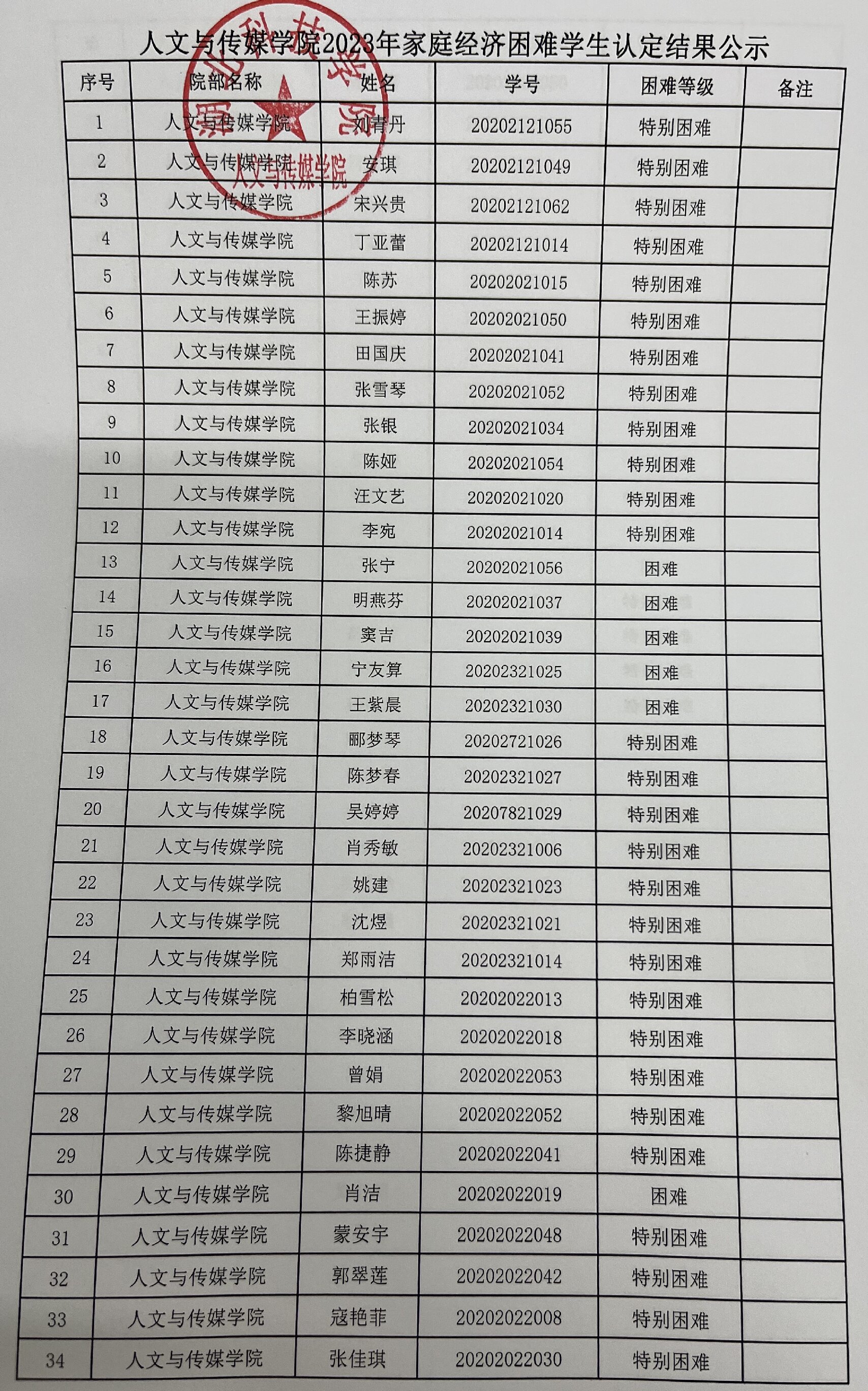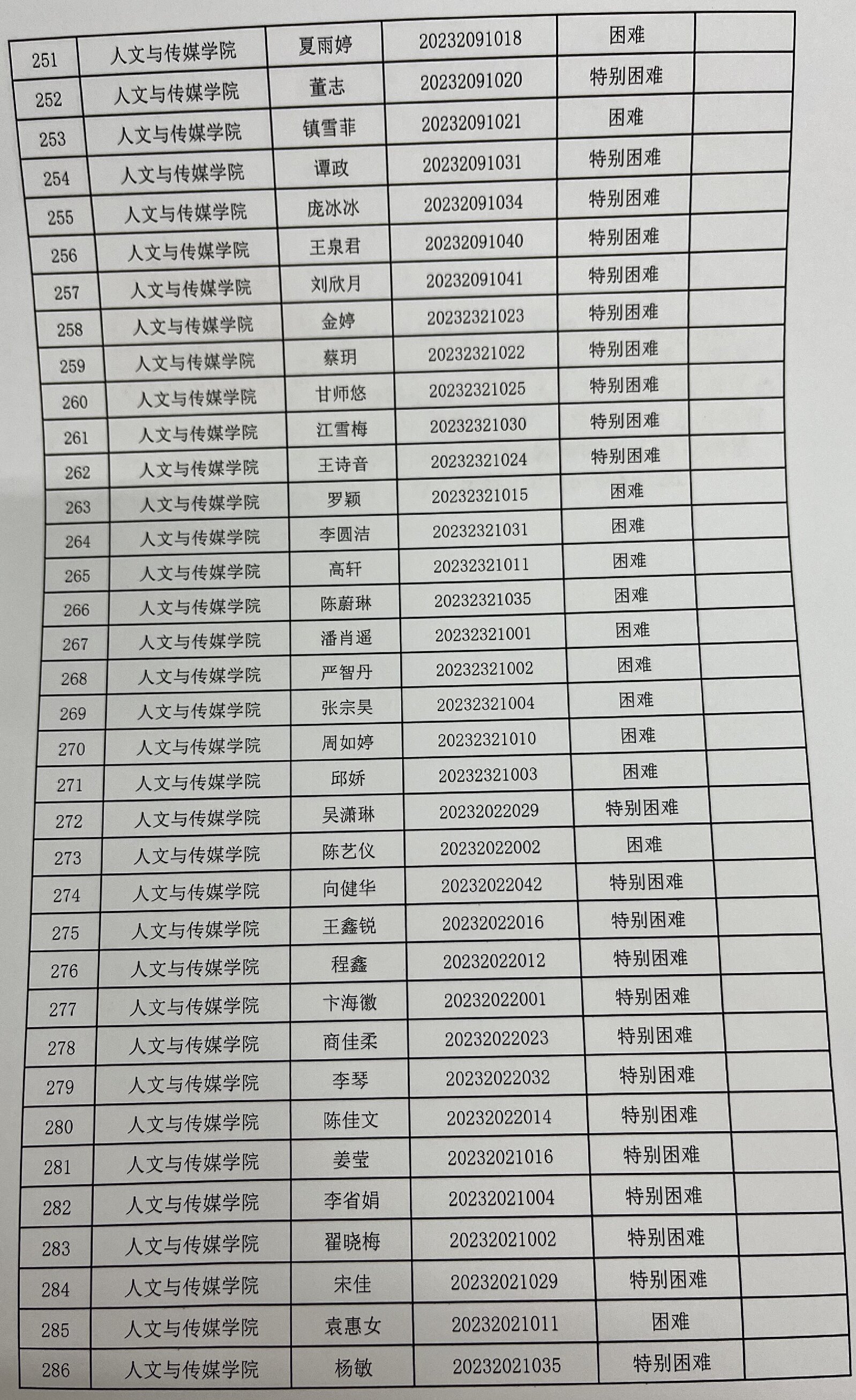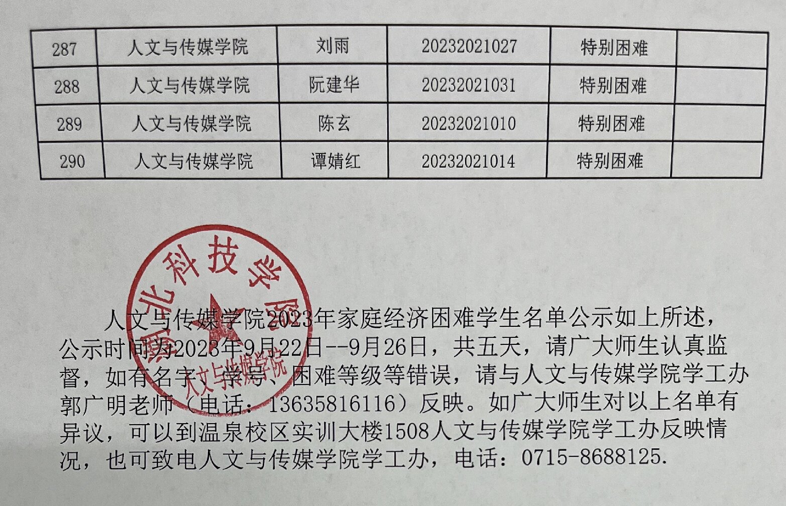 tyc7111cc太阳成集团2023年家庭经济困难学生认定名单及分班级汇总表公示