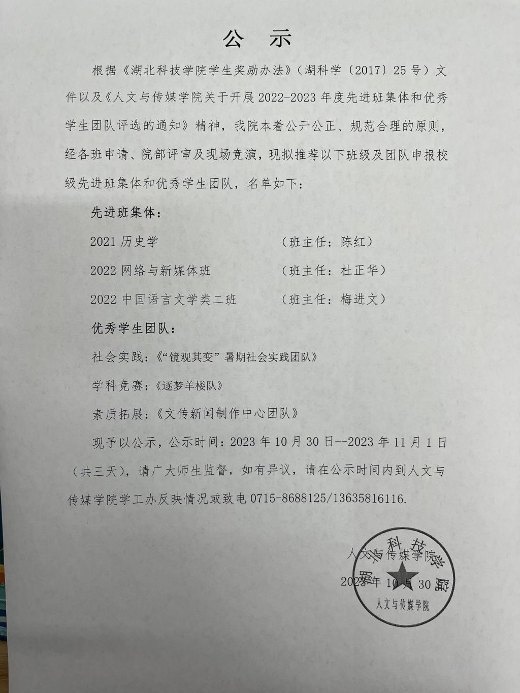 tyc7111cc太阳成集团2022-2023学年先进班集体和优秀学生团队拟推荐名单公示
