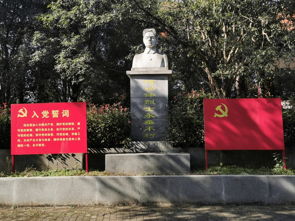 何功伟烈士陵园内,松柏环绕,丰碑矗立。在支部书记郭老师的指导下,学生党员周宇向支部成员介绍何功伟同志抗日救国,为革命事业英勇献身的事迹。