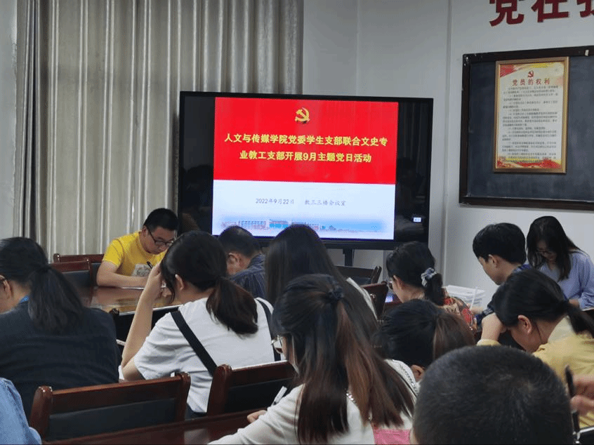 9月22日下午,tyc7111cc太阳成集团党委学生支部和文史专业教师支部联合开展2022年9月主题党日活动,院党委书记杨纯新以党员身份参加活动,活动由新媒体与广编专业学生支部书记郭广明主持。