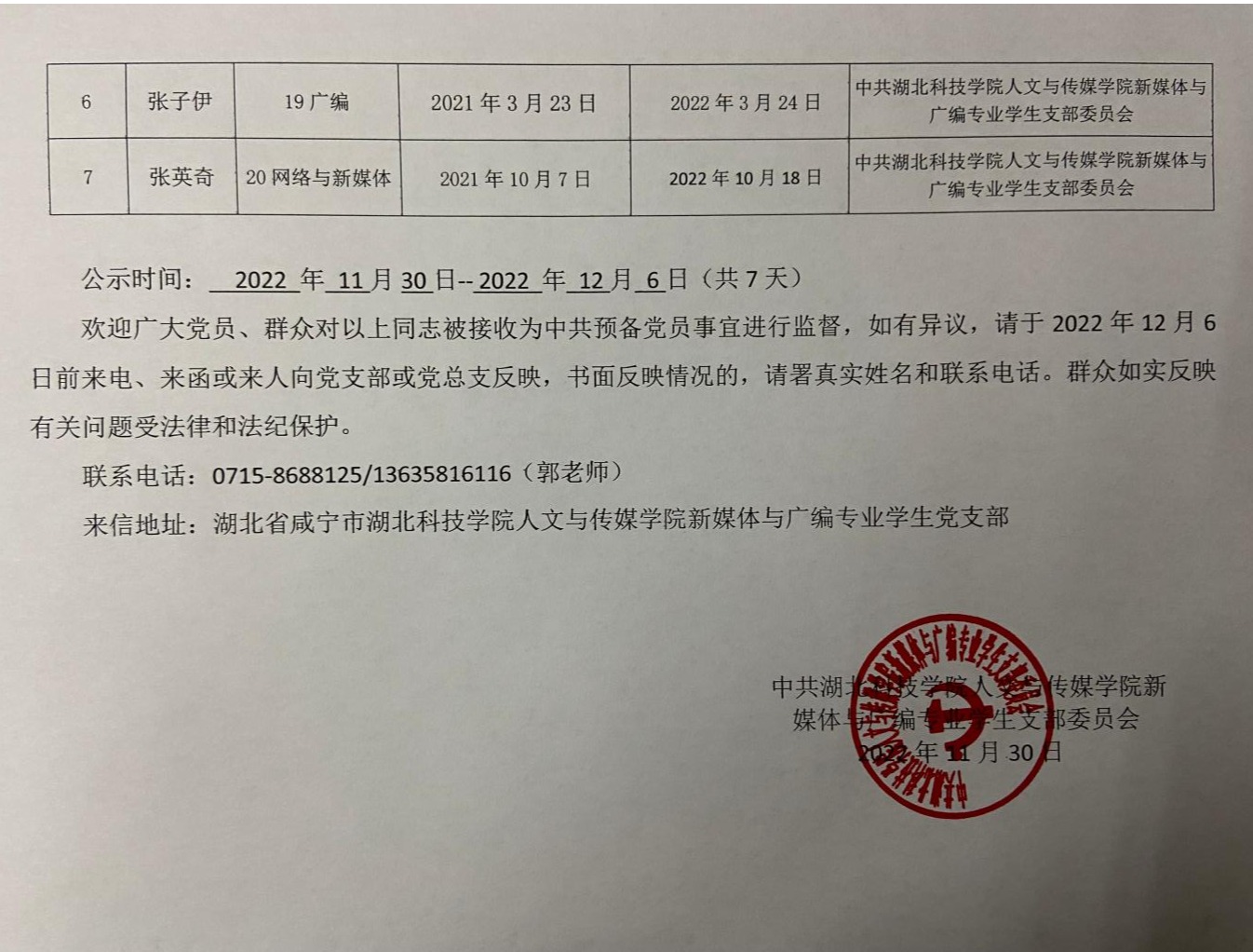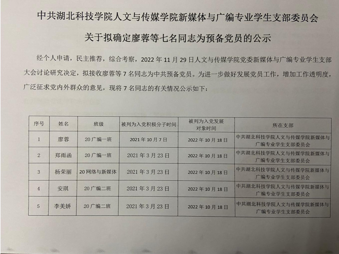 中共tyc7111cc太阳成集团新媒体与广编专业学生支部委员会关于拟确定廖蓉等七名同志为中共预备党员的公示