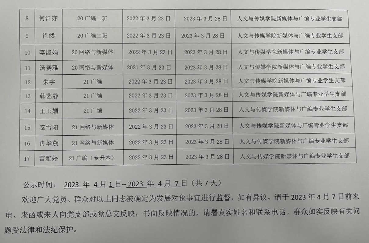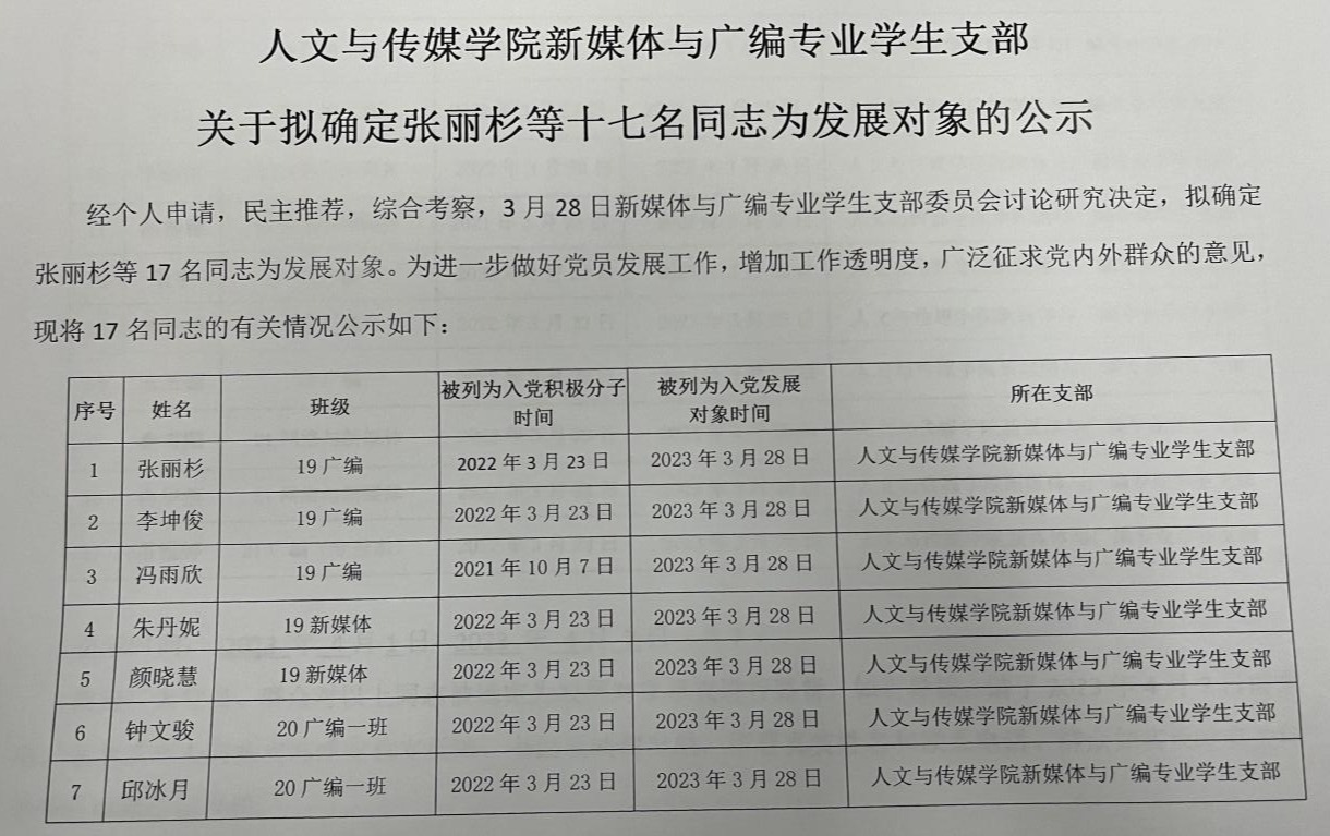 tyc7111cc太阳成集团党委新媒体与广编专业学生支部关于拟确定张丽杉等十七名同志为发展对象的公示