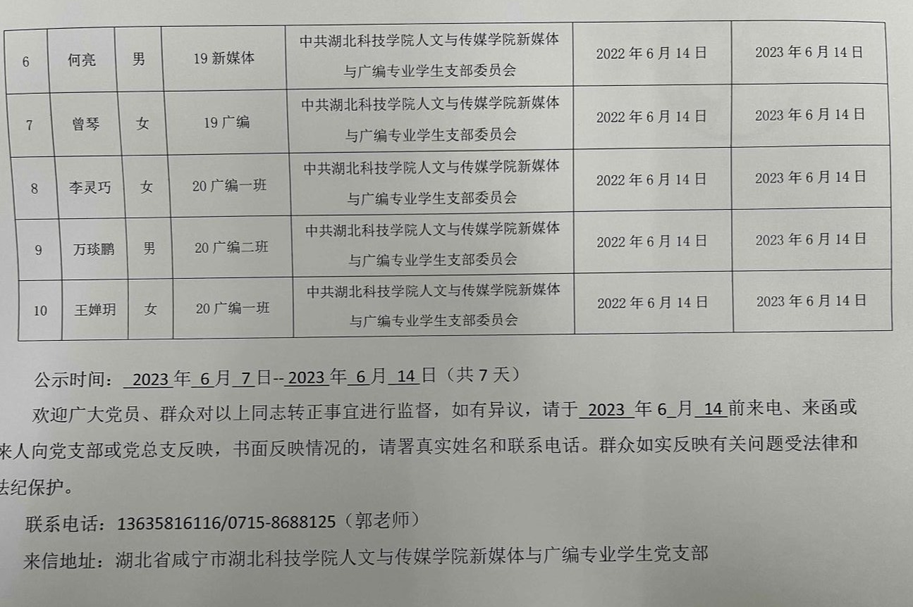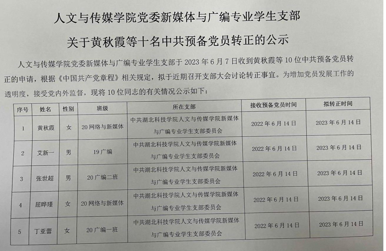 tyc7111cc太阳成集团党委新媒体与广编专业学生支部中共预备党员转正公示