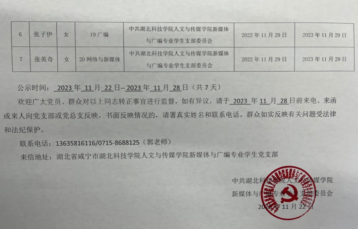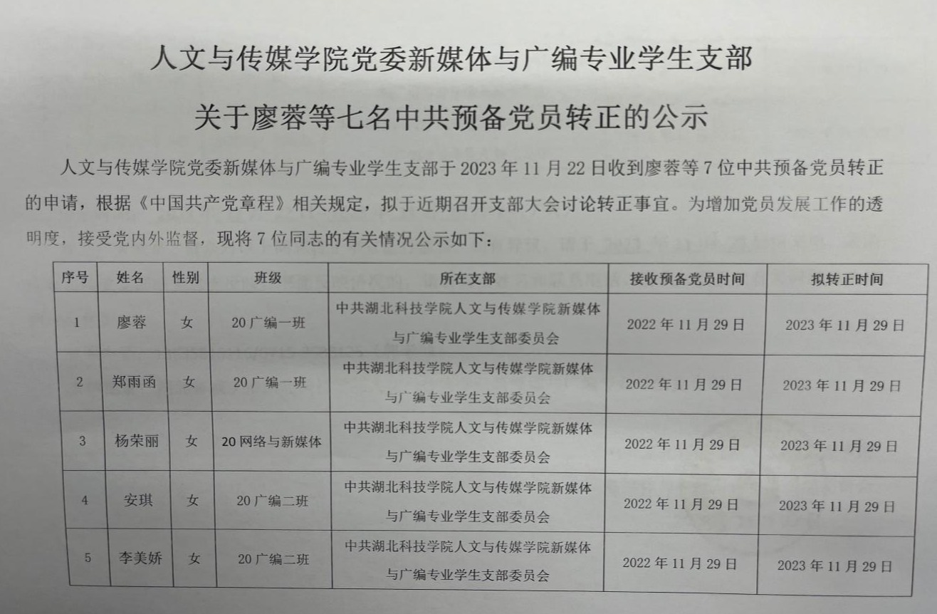 tyc7111cc太阳成集团党委新媒体与广编专业学生支部关于廖蓉等七名同志中共预备党员转正的公示