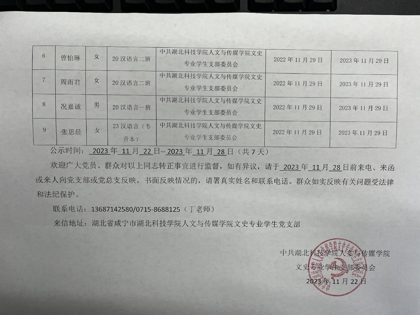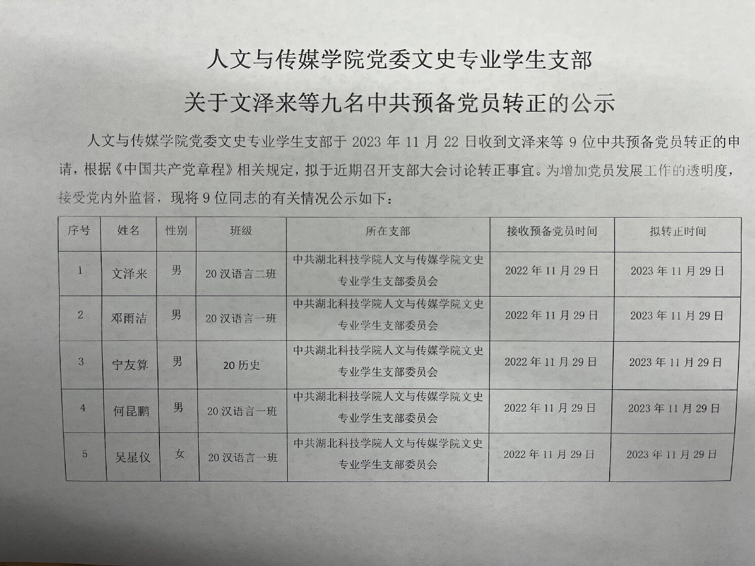 tyc7111cc太阳成集团党委文史专业学生支部关于文泽来等九名同志中共预备党员转正的公示