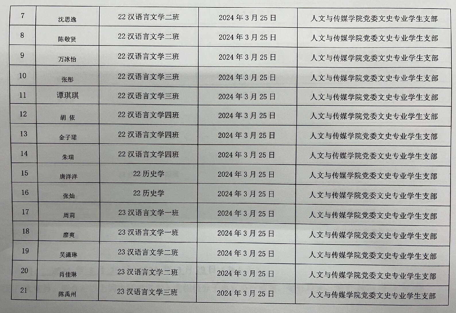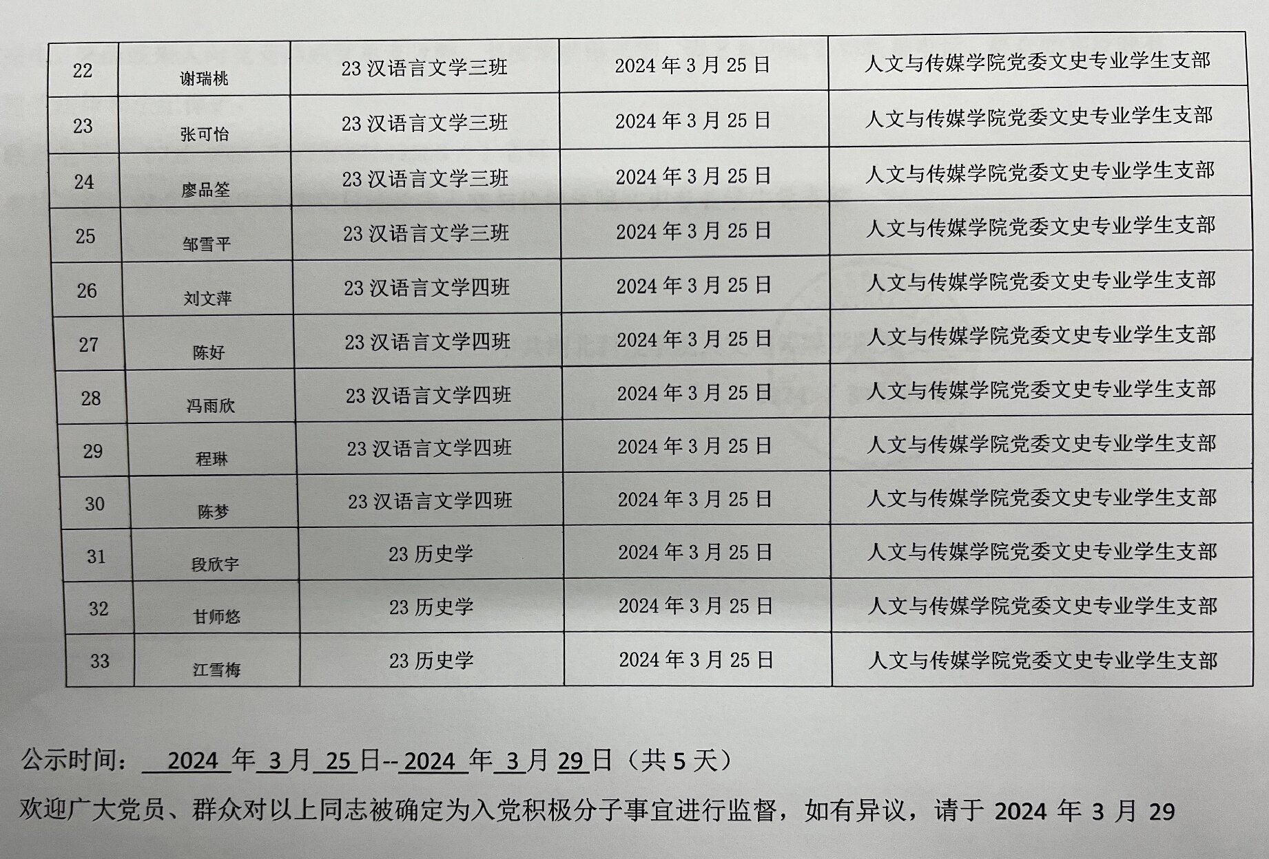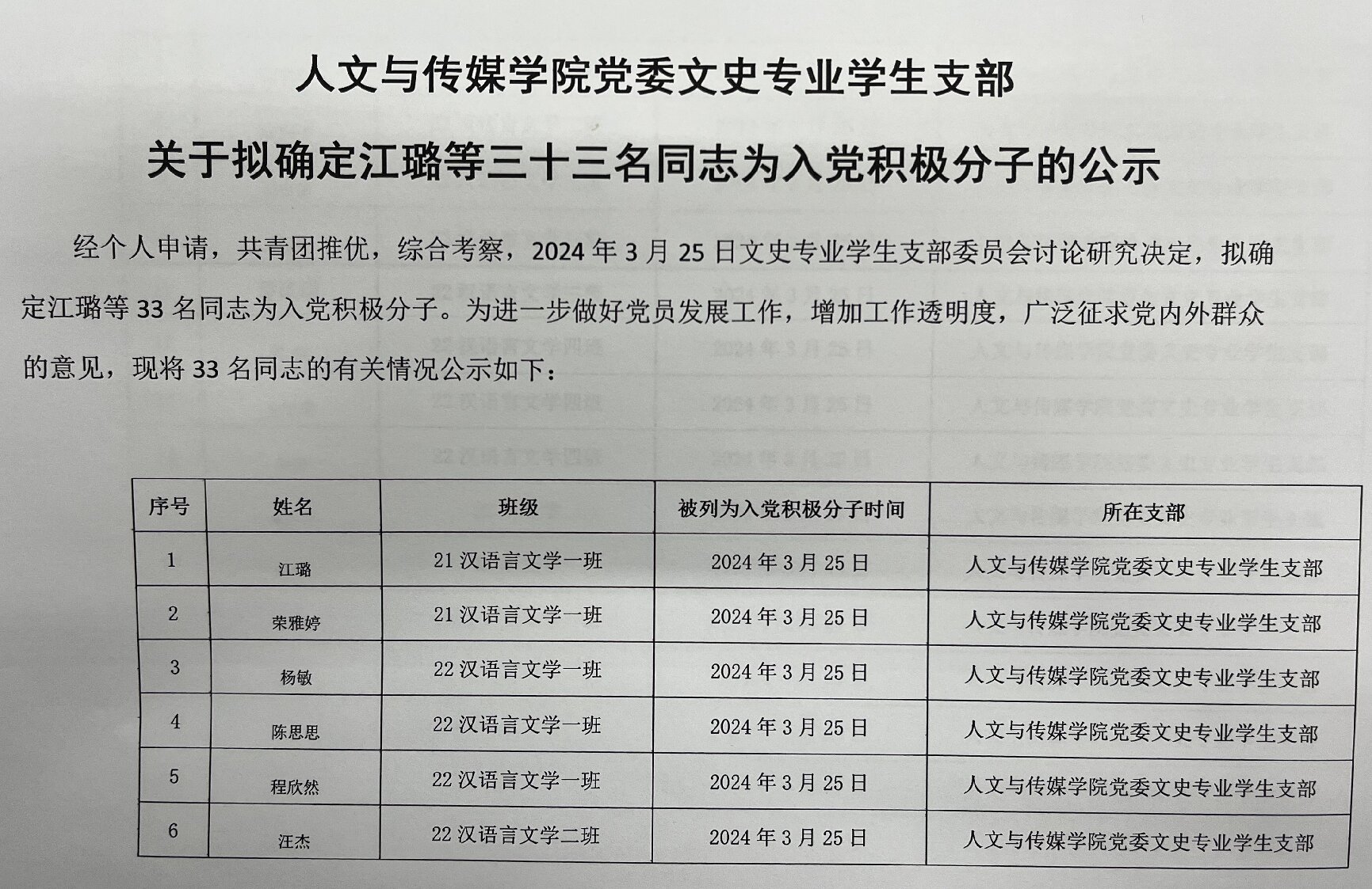 tyc7111cc太阳成集团党委文史专业学生支部关于拟确定江璐等三十三名同志为入党积极分子的公示