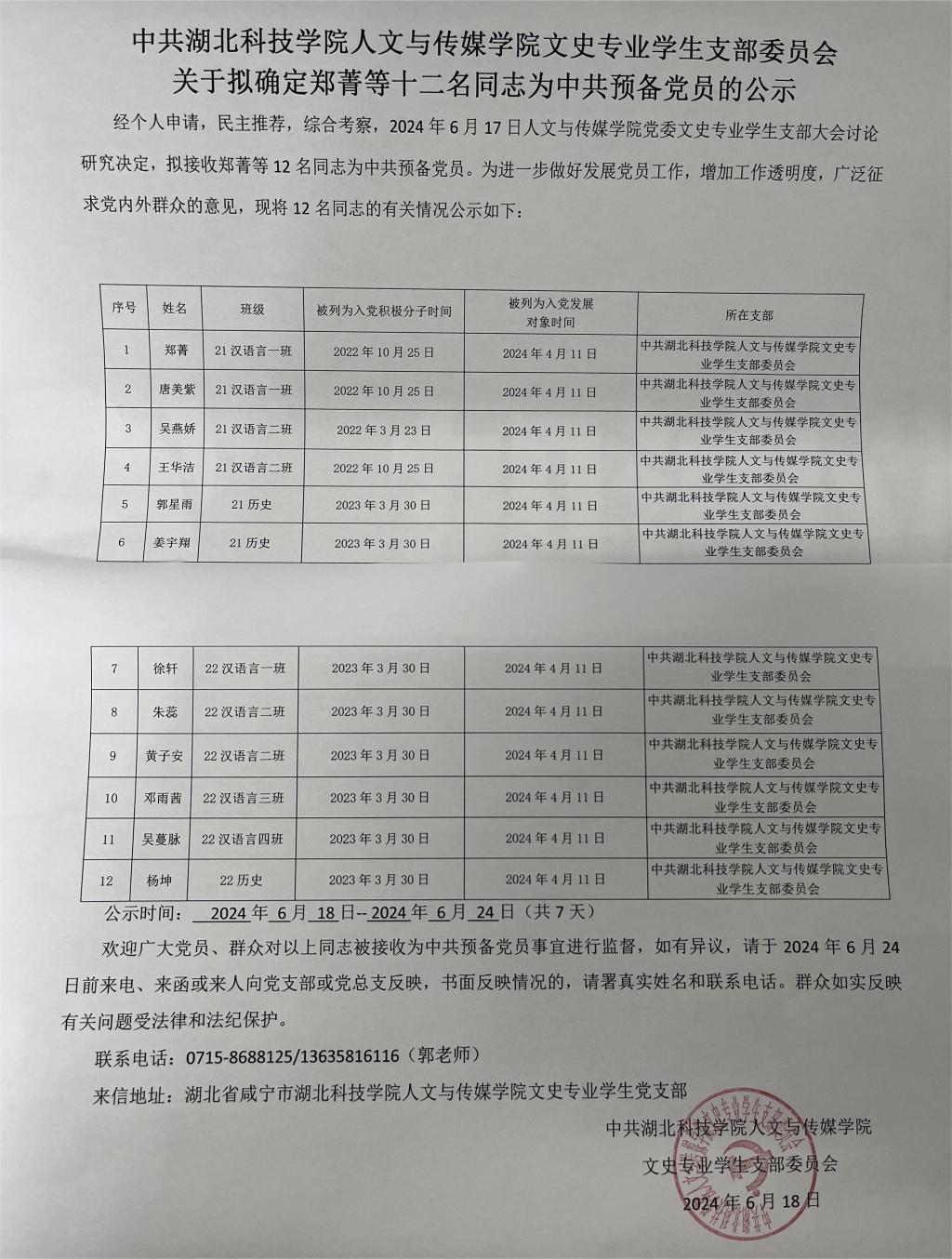 tyc7111cc太阳成集团党委文史专业学生支部关于拟确定郑菁等十二名同志为中共预备党员的公示