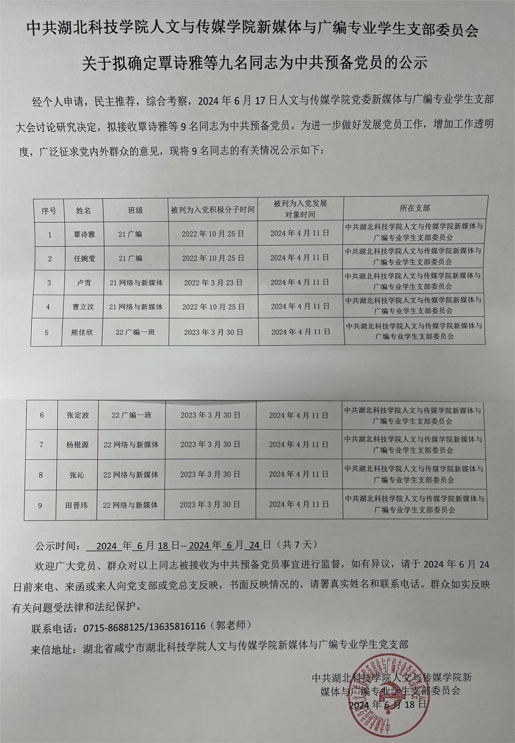 tyc7111cc太阳成集团党委新媒体与广编专业学生支部关于拟确定覃诗雅等九名同志为中共预备党员的公示
