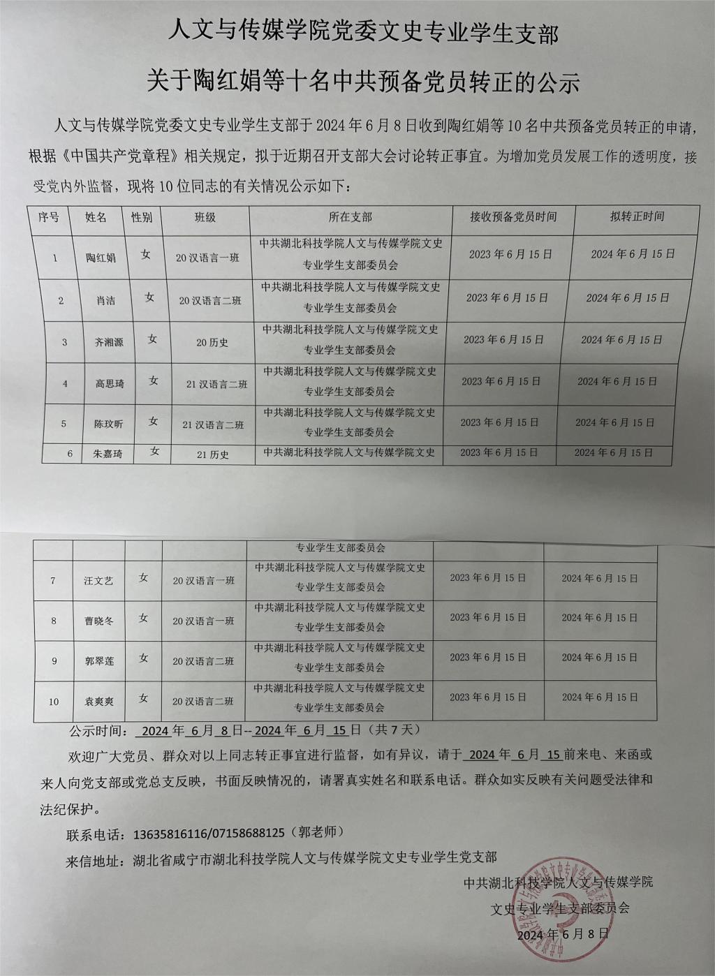 tyc7111cc太阳成集团党委文史专业学生支部关于陶红娟等十名中共预备党员转正的公示