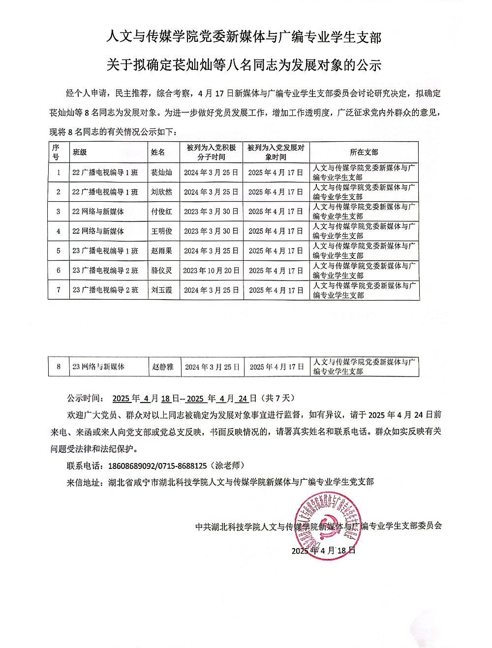 tyc7111cc太阳成集团党委新媒体与广编专业学生支部关于拟确定苌灿灿等八名同志为发展对象的公示