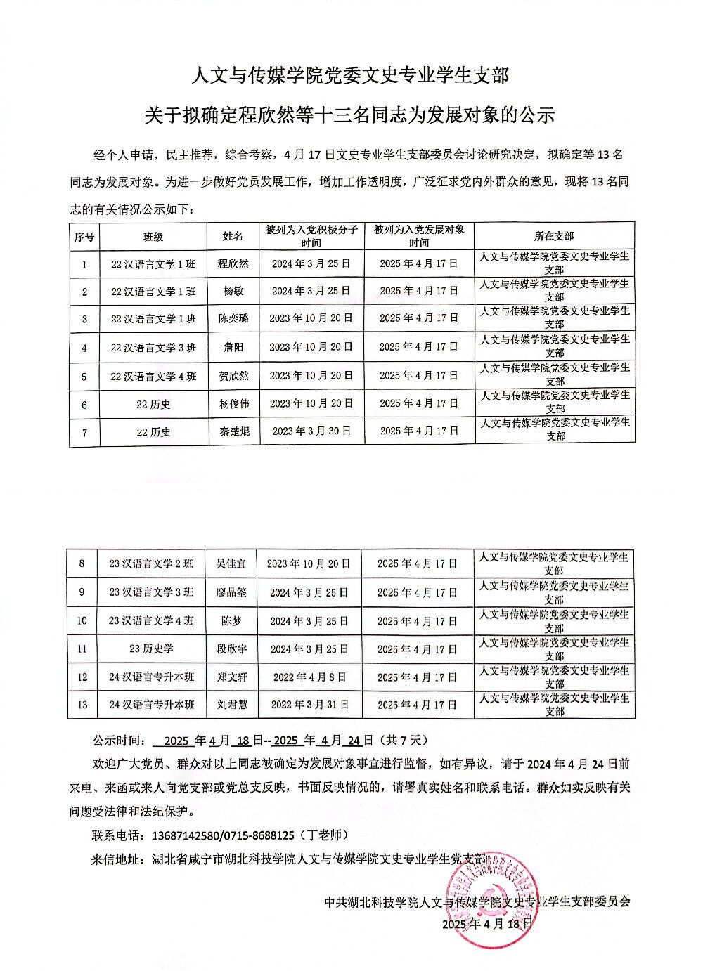 tyc7111cc太阳成集团党委文史专业学生支部关于拟确定程欣然等十三名同志为发展对象的公示