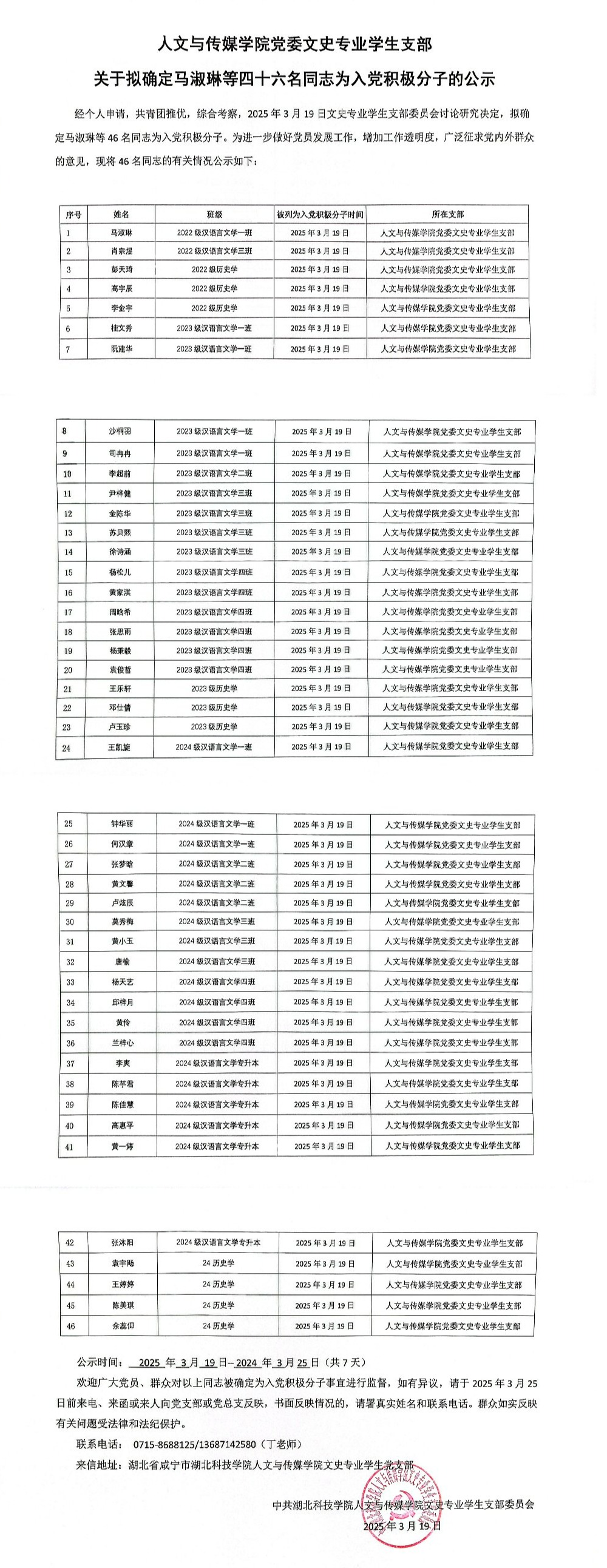 tyc7111cc太阳成集团党委文史专业学生支部关于拟确定马淑琳等四十六名同志为入党积极分子的公示