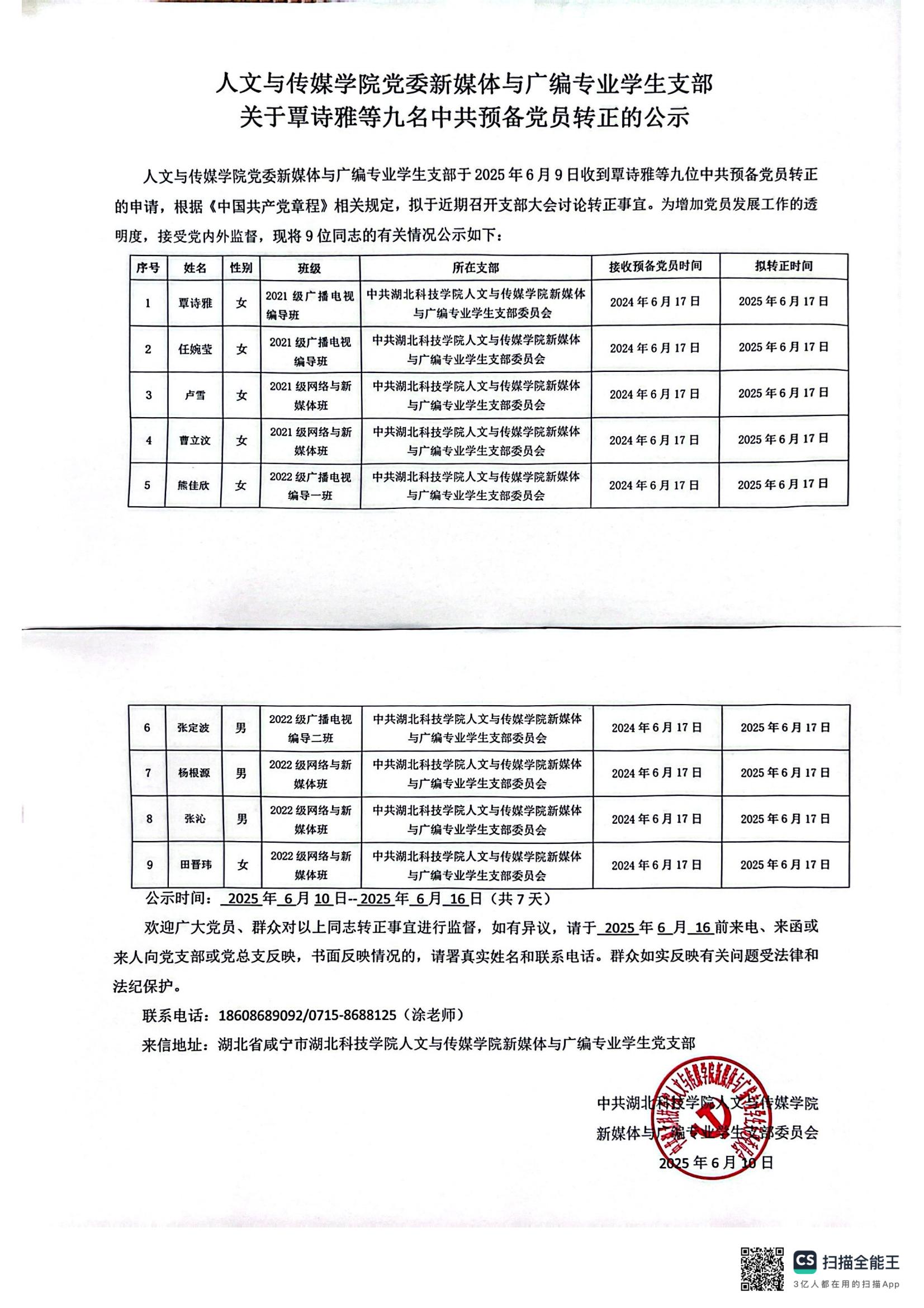 tyc7111cc太阳成集团党委新媒体与广编专业学生支部 关于覃诗雅等九名中共预备党员转正的公示