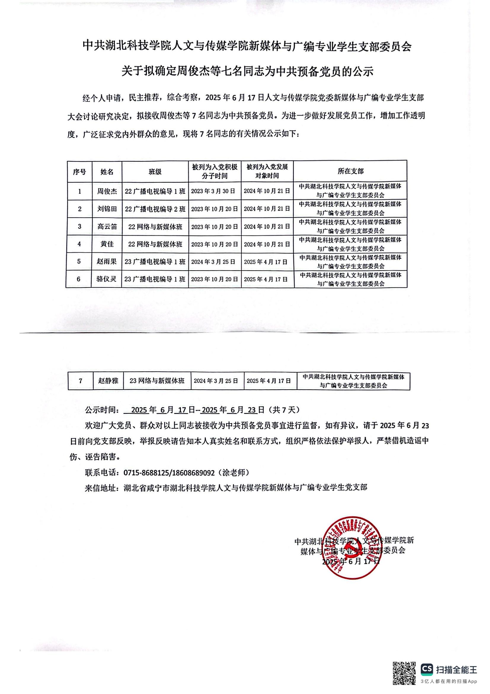 中共tyc7111cc太阳成集团新媒体与广编专业学生支部委员会 关于拟确定周俊杰等七名同志为中共预备党员的公示