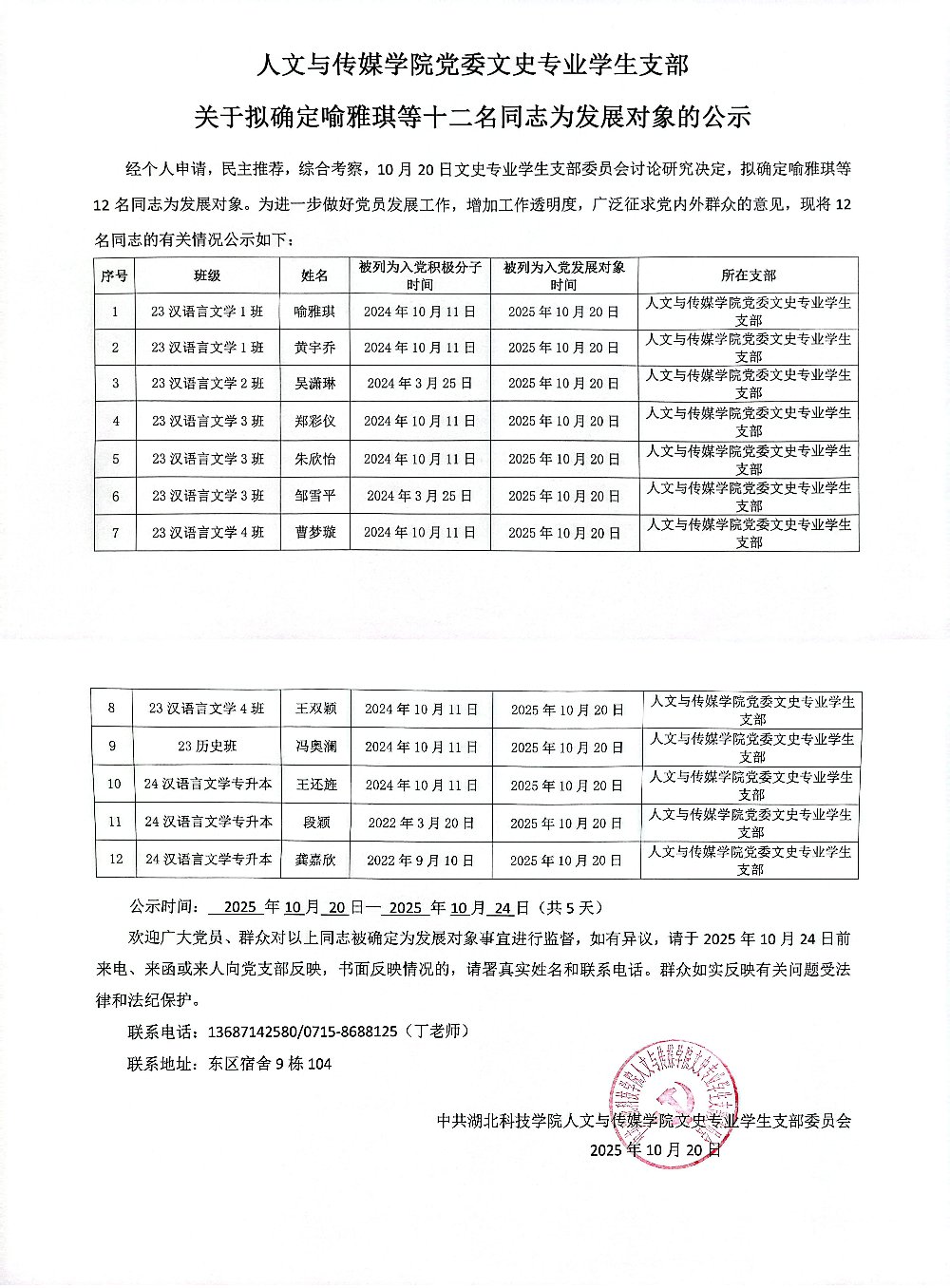 tyc7111cc太阳成集团党委文史专业学生支部关于拟确定喻雅琪等十二名同志为发展对象的公示