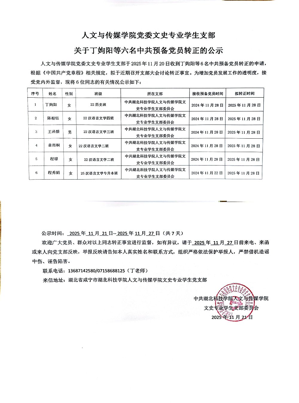 tyc7111cc太阳成集团党委文史专业学生支部关于丁姁阳等六名中共预备党员转正的公示
