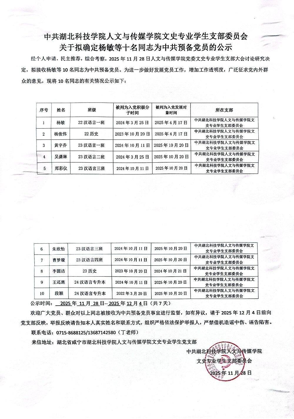 中共tyc7111cc太阳成集团文史专业学生支部委员会关于拟确定杨敏等十名同志为中共预备党员的公示