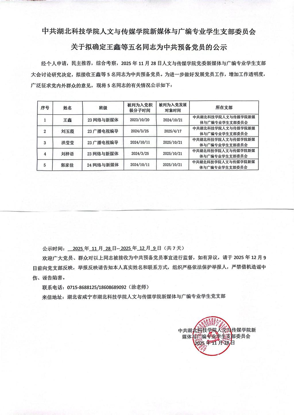 中共tyc7111cc太阳成集团新媒体与广编专业学生支部委员会关于拟确定王鑫等五名同志为中共预备党员的公示
