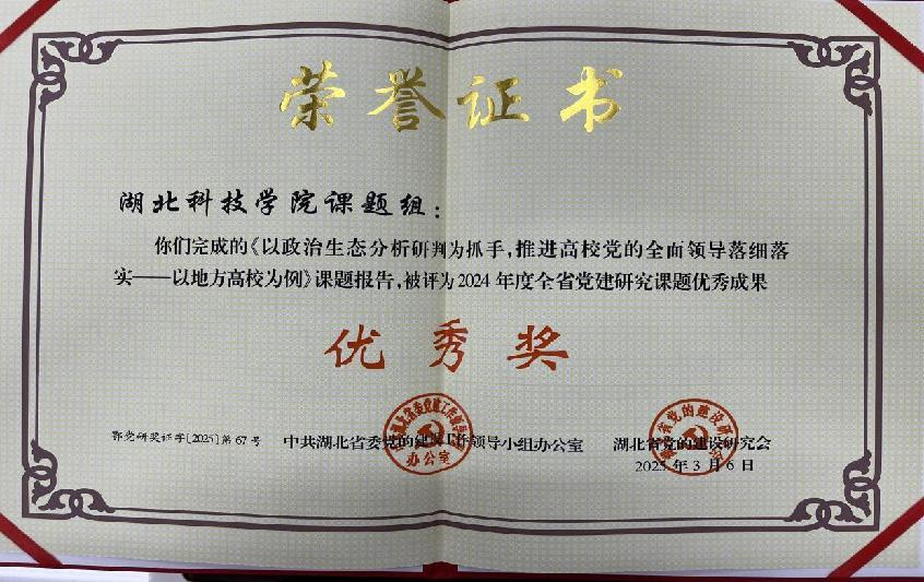 近期,中共湖北省委党的建设工作领导小组办公室与湖北省党的建设研究会共同公布了2024年度全省党建研究课题的杰出成果。在校纪委书记鄢文军同志的指导下,课题组提交的《以政治生态分析研判为抓手,推进高校党的全面领导落细落实——以地方高校为例》研究报告,凭借其独到的研究视角、深厚的理论基础和突出的实践意义,荣获了优秀成果优秀奖。文传学院教师参与该课题并发挥了重要作用。