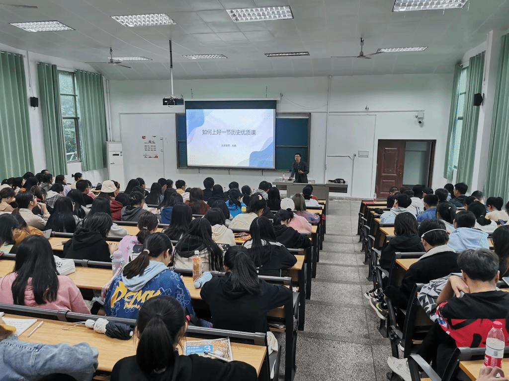 专家讲座环节,邀请到湖北大学历史文化学院副教授、专业教学技能竞赛负责人刘馗为全体师生作了《如何上好一节历史优质课》的报告。刘教授从优质课的定义、优质课的特征,备课的环节以及其他注意事项等方面分享了其多年带队参赛的典型案例和经验思考,他现身说法以“耐得住痛苦的打磨”来勉励广大师范生,为正在徘徊中的学生们鼓舞了斗志。